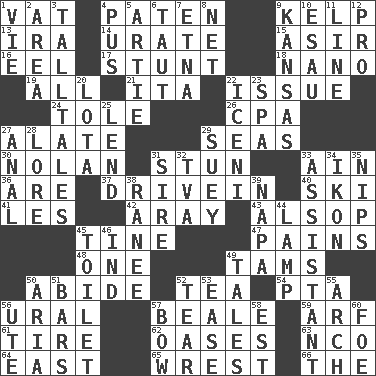 ACROSS 1. Large container 4. Eucharist need 9. Seaweed 13. Retirement account (abbr.) 14. A salt of uric acid 15. SW Saudi Arabia district 16. Snakelike fish 17. Difficult or unusual or dangerous feat 18. Billionth: prefix 19. Everything 21. Call ___ day 22. Come out of 24. Lacquered or enameled metalware 26. Tax preparer (abbr.) 27. Having winglike extensions 29. Oceans 30. Pitcher Ryan 31. Astound 33. The 18th letter of the Arabic alphabet 36. "We ___ not amused" (Victoria) 37. Popular '50s hangout 40. What Jean-Claude Killy likes to do 41. French article 42. Like ___ of sunshine 43. Columnist Joseph or Stewart 45. Prong on a fork 47. Aches 48. Single 49. Scottish caps 50. Stay 52. Beverage made from leaves 54. Parent Teacher Association (abbr.) 56. Mountain range 57. Memphis, Tenn. Street 59. Sandy's bark 61. Become fatigued 62. Fertile tracts in a desert 63. Non-commissioned officer (abbr.) 64. Compass direction 65. Obtain by seizing forcibly or violently 66. Definite Article DOWN 1. Compete 2. Type of rug 3. Baron Munchausen's specialties 4. Ichor 5. Nick name for Arthur 6. Pulled tight 7. Inactive volcano in Sicily 8. Fish or hair follower 9. Sunflower state 10. Son of Isaac 11. Actor's bit 12. Adept person 20. Globular water bottle used in Asia 22. Ancient Celtic tribe of eastern Britain 23. Health resort 25. Grant temporary use of 27. Of or related to the anus 28. Old wives' tales, e.g. 29. Chop _ 31. Beget 32. Federal power corp. 33. Aide 34. Image 35. Cuts off 38. The wife of a rajah (variant) 39. California wine valley 44. Desk light 45. Rest room 46. Working for oneself (abbr.) 49. Falsehoods 50. Roberta Peters solo 51. Oblong pieces of solid material 52. Rend 53. Relaxation 55. Bowlike part 56. Shoshoni 57. Ribbon knot 58. Eastern Standard Time (abbr.) 60. Enemy