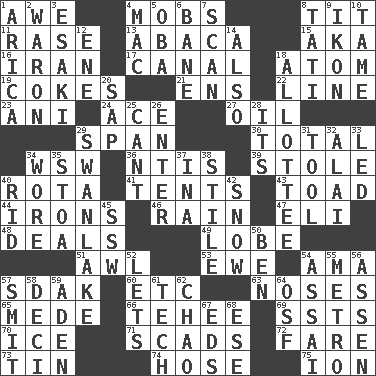 ACROSS 1. Deep reverence 4. Crowds into 8. Teat (slang) 11. Raze (variant) 13. Phillipine bananalike plant 15. Alias (abbr.) 16. SW Asia republic 17. Lessep's creation 18. Smallest unit of an element 19. Popular sodas 21. Followers of ems 22. Actor's bit 23. Cuckoo 24. Adept person 27. Petroleum 29. Connect, as a bridge 30. Add up to 34. Compass dir. 36. Nuclear Threat Initiatives 39. Fur scarf 40. Roll call or roster of names 41. Portable shelters 43. Frog relative 44. Metal shackles 46. Water falling in drops from the sky 47. Biblical high priest 48. Allots cards 49. Ear part 51. Leather borer 53. She-sheep 54. Nanny (var.) 57. Neighbor of Neb. 60. And so on (abbr.) 63. Olfactory organs 65. Ancient Persian 66. Giggle 69. Fast planes 70. Frozen water 71. Tons 72. Conductor's collection 73. Metal container 74. Stockings 75. Electrically charged atom DOWN 1. N. Chile seaport 2. Make _____ (do battle with) 3. 1973 Nobel Price Winner (Physics) Leo 4. Big _ 5. Chief or king in Benin or Nigeria 6. Object of repulsion 7. Glance over 8. Jacques of French films 9. Image 10. Docile 12. Compass dir. 14. In addition 18. One to whom something is allotted 20. Plant excrement 25. Patter 26. Keyboard key 28. ___ a Wonderful Life 29. Tchaikovsky ballet 31. Utensil 32. Mountain range southwest of Kyrgyzstan 33. Directed 34. Had on 35. Portico 37. _ tizzy (2 wds.) 38. Vertical member of a panel or frame 40. To free from 42. Frozen precipitation 45. Compass dir. 50. Benjamin's nick name 52. Allows 54. Slender Brazilian palm 55. Paris' subway 56. NE Netherlands city 57. Stricken, poetically 58. Tenth: prefix 59. Arabian gulf 61. Georgia ____ (Atlanta school) 62. US Secretary of Labor Elaine L. _ 64. Order of Saint Francis (abbr.) 67. Begley and Asner 68. Compass dir.