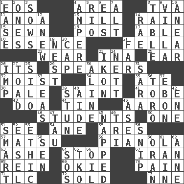 ACROSS 1. Greek goddess of the dawn 4. Length times width 8. Federal power corp. 11. Small Philippine buffalo 13. Place where flour is made 14. Water falling in drops from the sky 15. Stitched 16. Mail 17. Competent 18. Substance 21. Man or boy (slang) 22. Erode 23. _ tizzy (2 wds.) 25. Ewer handle 26. ___ a Wonderful Life 29. Orators 32. Wet 34. Car dealer's back yard 35. Had dinner 38. Light colored 39. Inhabitant of Heaven 41. Loose flowing garment 43. ___ good deed 44. Shallow baking pan 45. Composer Copland 46. SAT takers 50. Single 51. Perceive with the eye 54. One (Scot) 55. Ancient Greek god of war 57. Taiwanese island in East China Sea 59. Player piano 63. American tennis player Robert 64. Discontinue 67. SW Asia republic 68. It's straight from the horse's mouth 69. Migrant worker of the '30s 70. Ache 71. Affectionate concern, for short 72. Exchanged or delivered for money 73. Compass dir. DOWN 1. Comfort 2. Singles 3. Sty mamas 4. Electrical Unit 5. _ de Janeiro 6. Raised railways 7. The first octave above the treble staff 8. Eating place 9. Country residence 10. Approach 12. Afresh 14. Actress Charlotte 19. Egg locale 20. Head covering 21. At a great distance 23. Visual representation of an object 24. Remaining after all deductions 26. Naughty child 27. Frog relative 28. Grain storage tower 30. Place in a line 31. "Two Mules for Sister ____" 33. Oceans 36. "Corrida" creature 37. Inky black, to poets 39. Astound 40. Assistant 42. Compass dir. 45. At sea 47. The 19th letter of the Greek alphabet 48. Slept 49. Three (prefix) 51. Don Adams' spy role 52. Artist's stand 53. Moral principle 56. Clip 58. Elected rep. 60. NW Algerian seaport 61. (Had) reclined 62. Singer Murray 64. Distress signal 65. Ring climax 66. Lubricate