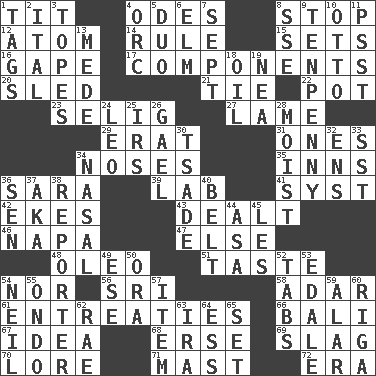 ACROSS 1. Teat (slang) 4. Lyric poems 8. Constrict 12. Tiny particle 14. Court order 15. Puts into a specified state 16. Stare wonderingly 17. Parts 20. Downhill vehicle 21. Neckwear 22. Cooking vessel 23. Former Milwaukee Brewers owner Bud 27. Unable to walk 29. Part of Q.E.F. 31. Singles 34. Olfactory organs 35. Taverns 36. "Two Mules for Sister ____" 39. Experiment locale 41. System (abbr.) 42. Supplements with great effort 43. Started a card game 46. California wine valley 47. Otherwise 48. Butter sub 51. Clothes sense 54. And not 56. _ Lanka 58. The sixth month of the Jewish calendar 61. Pleas 66. Indonesian resort city 67. The content of cognition 68. Celtic language 69. Volcanic refuse 70. Old wives' tales, e.g. 71. Vertical spar for supporting sails 72. Epoch DOWN 1. Labels 2. Slanted text style (abbr.) 3. Drinks excessively 4. The grampus (Milton) 5. Superhero pair 6. Shade tree 7. Back-to-school mo. 8. Compass dir. 9. 3-inch nail 10. Von Bismarck 11. Inconspicuous attention getter 13. Ancient Persian 18. Lubricate 19. Teachers' org. 24. Lion 25. Big collection agency 26. Highlander 28. Wet 30. Sadhe (variant) 32. Followers of ems 33. Fast jet (abbr.) 34. Rhinal 36. Elected rep. 37. Alias (abbr.) 38. Newsperson 40. Waist strap 44. White ___ sheet 45. French article 49. Compass dir. 50. Mouth or opening 52. Bar bills 53. Peak District village in England 54. Famous astronaut Armstrong 55. Southwest Nigerian state 57. A distinct part 59. Having or resembling wings 60. Capital of Latvia 62. Actress Charlotte 63. Retirement account (abbr.) 64. Double-curved letter 65. Arrange properly for use
