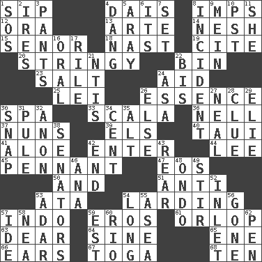 ACROSS 1. Small drink 4. Raised platform 8. Naughty children 12. Mouth or opening 13. Johnson of "Laugh-In" 14. Soft 15. Sir (Sp.) 18. Political cartoonist Thomas 19. Quote 20. Slender, wiry 22. Storage container 23. Table seasoning 24. Help 25. Luau accessory 26. Center 30. Health resort 33. Any of the three canals of the cochlea 36. 1994 drama film starring Jodie Foster 37. Religious women 39. Raised railways 40. "Change" in Tahitian 41. Medicinal plant 42. Keyboard key 44. Area sheltered from the wind 45. Pre-World Series prize 47. Greek goddess of the dawn 50. Also 51. Against 53. "One Day ___ Time" 54. Preparing or cooking with lard 57. _ china 59. Greek god of love 61. Fourth or lowest deck 63. Letter starter 64. Trig term 65. Compass dir. 66. Hearing organs 67. Ancient Roman robe 68. Nine, plus one DOWN 1. Mayday 2. Angers 3. Leg coverings 4. Mild oath, euphamism for damn 5. Like ___ of sunshine 6. It is 7. Arrange properly for use 8. Event 9. Count _ (2 wds.) 10. Pacific Standard Time (abbr.) 11. A female animal or person 16. Relating to the mouth 17. Cause heat under the collar 21. Nuclear Threat Initiatives 22. Twice 24. White ___ sheet 26. Otherwise 27. Be tempered by heat 28. A slight indication 29. Writer Wiesel 30. Fastener 31. Whine 32. Soon (poet.) 34. Penny 35. Keyboard modifier key 38. Elected representatives 42. Conclude 43. Buttocks 46. Santa ___, CA 48. Southwest Nigerian state 49. Use a spoon 52. An arm off of a larger body of water 53. The sixth month of the Jewish calendar 54. Yearn 55. At sea 56. Went 57. Binary compound 58. Teachers' org. 59. Eastern Standard Time (abbr.) 60. River (Sp.) 62. Fenced enclosure
