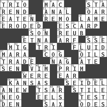ACROSS 1. Musical group of three 5. Big _ 8. R.R. building 11. Tear apart 12. Of or related to the anus 14. Boat paddle 15. Eroded 17. San ____ (Riviera town) 18. Unable to walk 19. Worn away 21. Fortification 23. Male offspring 25. Reuben's nickname 26. Inactive volcano in Sicily 27. Sandy's bark 28. Compass dir. 31. Russian fighter aircraft 33. Three (prefix) 35. Watery 37. Hindu Mythology: god of death 38. Gear tooth 40. Petroleums 41. Swap 43. Tired old horse 45. Had dinner 46. Elected rep. 47. Zeal 50. Demure 52. We are 53. Hearing organ 54. Sunflower state 56. Beer mug 61. Afresh 62. Russian ruler of old 65. Vertical member of a panel or frame 66. Modern: prefix 67. Snakelike fish 68. Trial 69. Lair 70. Saxophone 71. Lyric poems DOWN 1. Relationship diagram 2. Located in or toward the back 3. To the inside or interior of 4. Wrote a lyric poem 5. Make imperfect 6. One (Scot) 7. Device for capturing images 8. Fly high 9. Pack (down) 10. "We ___ not amused" (Victoria) 13. Failure 16. A home for chicks 18. Experiment locale 20. Do not 22. _ links 24. Drug cop 26. Mild oath 28. Costume for a special activity 29. Filth; sediment 30. Begley and Asner 31. Female horse 32. SW Asia republic 34. Electrically charged atom 36. Rich soil 37. Mountains (abbr.) 39. Stare wonderingly 42. Nights before holidays 44. Pate de foie ____ 48. Feeling or showing extreme anger 49. Makes clutter 51. Angers 52. Compass dir. 54. Leg joint 55. Age 57. "Tell ____ the Marines!" 58. Passed on 59. Otherwise 60. Allows 61. Added to 63. Insect wing 64. Acura sports coupe