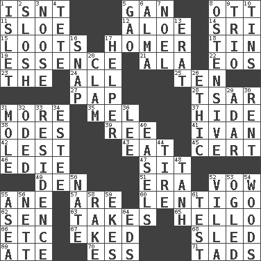ACROSS 1. Is not 5. Separate the seeds from cotton 8. Baseball player Mel 11. A type of plum 12. _ vera 14. Indian title of respect (Mr.) 15. Plunders 17. Simpsons dad 18. Shallow baking pan 19. Substance 21. Chicken ___ king 22. Greek goddess of the dawn 23. Definite Article 24. Everything 25. "___ Little Indians" 27. Infant food 28. Russian ruler of old 31. Greater amount 35. Cartoonist voice _ Blanc 37. Flintstone garb 38. Lyric poems 39. To separate or throw off 41. _ the terrible 42. For fear that 43. Consume 45. Foregone conclusion 46. Singer Brickell 47. Be seated 49. Lair 51. Period 52. Promise 55. A saturated hydrocarbon 57. "We ___ not amused" (Victoria) 60. Small, flat, pigmented spot on the skin 62. Elected rep. 63. Proceeds 65. Phone greeting 66. And so on (abbr.) 67. Made supply last 68. Downhill vehicle 69. Had dinner 70. Double-curved letter 71. Small boys DOWN 1. Small island 2. Make a splashing sound 3. Trap for birds or small mammals 4. False hair 5. E Mali city 6. _ mater 7. Christmas carol 8. Clearly or manifestly demonstrative 9. Musical group of three 10. Metal containers 13. Part of Q.E.F. 16. Fastener 17. Assistant 20. Burrowing marine mollusk 26. Moral principle 29. The sixth month of the Jewish calendar 30. Monthly bill 31. Undercover agent 32. Wrote a lyric poem 33. Dwelling 34. First name in cosmetics 36. Area sheltered from the wind 40. Artist's stands 44. Hoop that covers a wheel 48. Hyperbolic tangent 50. Nathan's nickname 52. Country estate 53. Stared at amorously 54. Forest 55. Toward the sea 56. Remaining after all deductions 58. Immoral or dissolute person 59. Makes supply last 61. Trial 64. Begley and Asner