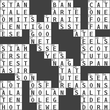 ACROSS 1. Comedian Laurel of Laurel & Hardy 5. Bar 8. Feline 11. Falsehood 12. Johnson of "Laugh-In" 14. Single 15. Leaves out 17. Distinguishing feature 18. Enemy 19. Small, flat, pigmented spot on the skin 21. Fast jet (abbr.) 22. Avid follower 23. Compass dir. 24. Thick or sticky substance 25. Had dinner 27. Fish or hair follower 28. Snakelike fish 31. Thailand, formerly 35. Compass dir. 37. Highlander 38. Celtic language 39. Affirmative reply 41. Ballerina skirt 42. Trial 43. Tired old horse 45. Connect, as a bridge 46. SW Saudi Arabia district 47. Make lace 49. Male offspring 51. Shoshoni 52. Ocean 55. Car dealer's back yard 57. Order of Saint Francis (abbr.) 60. Thinks logically 62. Chicken ___ king 63. Pitcher Ryan 65. Table seasonings 66. "___ Little Indians" 67. Cassini of fashion 68. It may be bright or harebrained 69. Being at a high temperature 70. She-sheep 71. Dormintory (informal) DOWN 1. Took without asking 2. Domesticates 3. Place in a line 4. Remaining after all deductions 5. Oblong piece of solid material 6. Caspian sea tributary 7. Nuclear Threat Initiatives 8. Java holder (2 wds.) 9. Small Philippine buffalo 10. Adolescent 13. Singer James 16. Attach a signature 17. A girl or young woman (variant) 20. Travels 26. Trials 29. Globular water bottle used in Asia 30. Astound 31. Bristle 32. Angers 33. Helper 34. Paris' subway 36. Car or cant ending 40. Titan orbits this 44. Yard entry 48. Afternoon social gatherings 50. Words to Nanette 52. Twentieth part of a lira 53. Keyboard key 54. Indian state 55. Thin strip of wood or metal 56. Margarine 58. Flatfish 59. Soared 61. Expressed in words 64. Personal question