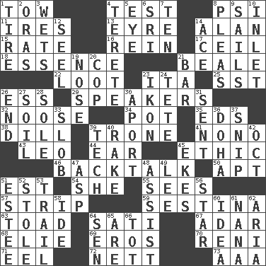 ACROSS 1. Pull behind 4. Trial 8. Air pressure measure (abbr.) 11. Angers 13. Jane of fiction 14. Actor Alda or Thicke 15. Assign a rank or rating to 16. It's straight from the horse's mouth 17. To provide with a ceiling 18. Substance 21. Calif. Air Force Base 22. Plunder 23. Call ___ day 25. Fast jet (abbr.) 26. Double-curved letter 29. Orators 32. Trap for birds or small mammals 34. Cooking vessel 35. Begley and Asner 38. Deli pickle 39. Heavy duty weighing machine 41. Words to Nanette 43. Lion 44. Ewer handle 45. Moral principle 46. Sass 50. Fitting 51. Eastern Standard Time (abbr.) 54. A female animal or person 55. Observes 57. Long narrow piece of something 59. French poetic form 63. Frog relative 64. Suttee (variant) 67. The sixth month of the Jewish calendar 68. Writer Wiesel 69. Greek god of love 70. Painter Guido (1575-1642) 71. Snakelike fish 72. Remaining after all deductions 73. American Automobile Association (abbr.) DOWN 1. Hoop that covers a wheel 2. Mouths or openings 3. Moistens 4. Cylindrical with tapered ends 5. Sight organ 6. _ Lanka 7. "___ Little Indians" 8. Entreaties 9. Moves on water 10. An arm off of a larger body of water 12. Sew up the eyelids of hawks and falcons 14. Adept person 19. Characteristic smell of wine 20. Police officer (slang) 21. Oblong piece of solid material 23. Visual representation of an object 24. False hair 26. Conclusion 27. Land 28. Not divided or shared with others 30. To the left, to Queeg 31. Posted 33. Oscar Madison type 36. Capital of the state of Qatar 37. Clip 39. Technician 40. Libertine 42. Sep. follower 45. Makes supply last 47. Cleo's killer 48. Help 49. Area sheltered from the wind 51. First name in cosmetics 52. Took without asking 53. Get behind 56. Play the lead 58. Binary compound 60. The content of cognition 61. Nanny 62. Operatic vocal solo 64. Elected rep. 65. "We ___ not amused" (Victoria) 66. Small child