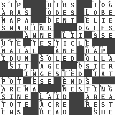 ACROSS 1. Small drink 4. Claim 8. Coat; cloak 11. Ancient river in northeast Turkey 13. Lyric poems 14. Ear part 15. California wine valley 16. Gouge 17. Writer Wiesel 18. Catching in a trap 21. Stares at amorously 22. Queen of England 1702-14 23. Cards in a Roman deck? 25. Compass dir. 26. Shoshoni 29. One of the two male reproductive glands 32. Relating to or accompanying birth 34. A saturated hydrocarbon 35. Strike 38. Goddess of spring and wife of Bragi 39. Having a sole or soles 41. Water jar 43. Be seated 44. Ripen 45. Flexible twig of a willow tree 46. Eaten 50. Make lace 51. Plant holder 54. Compass dir. 55. Conclusions 57. Sports stadium 59. Nestling 63. Trig term 64. Put down 67. Length times width 68. Carryall 69. 43,560 square feet 70. Repose 71. Followers of ems 72. Necklace unit 73. A female animal or person DOWN 1. Without 2. SW Asia republic 3. Dad 4. Evades 5. Binary compound 6. Benjamin's nick name 7. Fast jet (abbr.) 8. For Whom the Bell _____ 9. Off-Broadway awards 10. Honkers 12. "Two Mules for Sister ____" 14. Part of a journey 19. International (abbr.) 20. Compass dir. 21. Petroleum 23. Actor's bit 24. On the rocks 26. Corn or form start 27. Bits 28. Needle case 30. Stories 31. Greek god of love 33. Opposed to 36. Set down 37. Entreaty 39. Sinks 40. Double curve, resembling the letter S 42. Nonscientific branch of learning 45. Likelihood 47. Teachers' org. 48. Watched over 49. Compass dir. 51. Thick mixture 52. Constellation of myth 53. Portable shelters 56. Play the lead 58. Born 60. Angers 61. Tender 62. Yard entry 64. Experiment locale 65. Adept person 66. Lyricist Gershwin