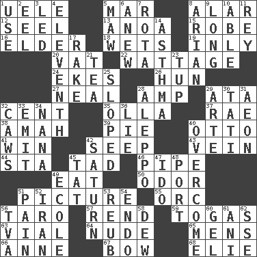 ACROSS 1. Ubangi River tributary 5. Impair 8. Having or resembling wings 12. Stitch closed the eyes of (a falcon) 13. Small Philippine buffalo 15. Loose flowing garment 16. A person who is older than you are 18. Moistens 19. In an inward manner 20. Large container 22. Electrical Measurement 24. Makes supply last 26. Attila the _ 27. Anneal 28. Electrical Unit 29. "One Day ___ Time" 32. Penny 35. Spanish pot 37. Actress Charlotte 38. Nursemaid 39. Sliced dessert 40. "Beetle Bailey" pooch 41. Victory 42. Ooze 43. Distinctive style or manner 44. R.R. building 45. Bit 46. Corncob 49. Ingest 50. Scent 51. Photo 55. The grampus (Milton) 56. Pacific island yam 57. Tear apart 59. Ancient Roman robes 63. Small bottle 64. Naked 65. Not women's 66. Queen of England 1702-14 67. Ribbon knot 68. Writer Wiesel DOWN 1. Purpose 2. Snakelike fish 3. Directed 4. Veterans Day date 5. Opening into something insatiable 6. Afresh 7. Roll call or roster of names 8. Believer in; advocate of (suffix) 9. Protracted 10. Competent 11. Marina Del _, California 14. Respiratory problem 17. Immoral or dissolute person 21. Afternoon social gathering 23. Uncastrated adult male sheep 25. Slanted 28. City in Syria 29. Johnson of "Laugh-In" 30. Jacques of French films 31. A really long time 32. Crow sounds 33. Send forth 34. Grandmother 36. Untruth 40. Conquer 42. Titan orbits this 45. Make lace 47. Wedding promise 48. Left side of a ship or aircraft 49. Learning spot: Fr. 51. Ache 52. SW Asia republic 53. Reuben's nickname 54. Inside; within (prefix) 56. Federal power corp. 58. Morning condensation 60. Set 61. Cuckoo 62. Compass dir.