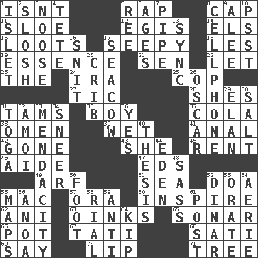 ACROSS 1. Is not 5. Hit sharply and swiftly 8. Head covering 11. _ gin 12. Armor plate that protects the chest 14. Raised railways 15. Plunders 17. Oozy 18. French article 19. Gist 21. Elected rep. 22. Allow 23. Definite Article 24. Lyricist Gershwin 25. Police officer (slang) 27. Nervous spasm 28. "______ My Girl" (Turtles hit) 31. Scottish caps 35. Male child 37. Root beer relative 38. Presage 39. Dripping 41. Of or related to the anus 42. Went 43. A female animal or person 45. Monthly bill 46. Assistant 47. Begley and Asner 49. Sandy's bark 51. Ocean 52. ___ good deed 55. Big _ 57. Mouth or opening 60. Heighten or intensify 62. Black tropical American cuckoo 63. Pig sounds 65. Underwater navigation system 66. Plant holder 67. Jacques of French films 68. Suttee (variant) 69. Declare 70. Mouth edge 71. Family _ (genealogy) DOWN 1. Small island 2. Splash clumsily 3. Trap for birds or small mammals 4. Wig 5. To sift 6. Eons 7. Corncob 8. Portable communications device 9. Toward shelter 10. Inconspicuous attention getter 13. Synchronize (abbr.) 16. In a ____ (agitated or irritated) 17. Manatee 20. Baby bed with high sides 26. Motion picture award 29. Style 30. Table seasoning 31. Ancient Roman robe 32. Mine, in Marseilles 33. Ananias' fault 34. Contemptuous expression 36. Consenting reply 40. College paper 44. Locale of original sin 48. Backtalk 50. Pick up the tab 52. Middle Eastern gold or silver currency 53. Declaim 54. Nest on high 55. Atlas contents 56. Small Philippine buffalo 58. Monetary unit of Yemen 59. Opposed to 61. Mail 64. Sleep