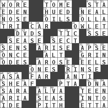ACROSS 1. Had on 5. Heavy book 9. R.R. building 12. Locale of original sin 13. Became colored 14. Anneal 15. Olfactory organ 16. Lubricates 17. Spanish pot 18. Three (prefix) 19. Auto 21. A small or young owl 22. Movie discs 24. Nervous spasm 26. Compass dir. 27. Gospel singer Marvin 28. Religious group 29. Elected reps. 30. Get up 32. Domed church section 36. Single time 37. Keyboard modifier key 38. Broad smile 39. Lyric poems 40. Came up 42. Snakelike fish 43. Singles 44. Remove soap 46. White ___ sheet 49. At a great distance 50. Against 51. To gather and bind into a bundle 53. Parent Teacher Association (abbr.) 54. Heredity factor (abbr.) 57. "Two Mules for Sister ____" 58. Inventor's middle name 61. Adolescent 62. Roberta Peters solo 63. Oceans 64. To the inside or interior of 65. Binary compound 66. Heart or essence 67. Singer James DOWN 1. Left 2. Aroma 3. Dwelling 4. Compass dir. 5. Son of Odin 6. Fr. "Yes" 7. Cartoonist voice _ Blanc 8. Begley and Asner 9. Makes a sale 10. Lies 11. Having winglike extensions 14. At this time 19. Music discs 20. At sea 21. Sep. follower 23. Flower holders 24. Trials 25. Frozen water 27. Transmit 28. Grain storage towers 29. "Barney Miller" actor Jack 31. Less widely known 32. Representative 33. Elected leader of a country 34. Filth; sediment 35. Followers of ems 40. Santa ___, CA 41. Part of Q.E.F. 43. No longer planned or scheduled 45. _ tizzy (2 wds.) 46. Slender Brazilian palm 47. Pottery fragment 48. Nest on high 52. American Automobile Association (abbr.) 53. Romantic infatuation 55. Remaining after all deductions 56. Small Philippine buffalo 58. Viper 59. Flowery wreath 60. Large container 61. Standoff