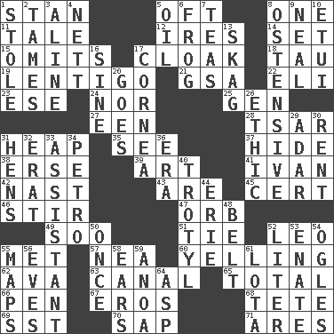 ACROSS 1. Comedian Laurel of Laurel & Hardy 5. Often (poetically) 8. Single 11. Story 12. Angers 14. Arrange properly for use 15. Leaves out 17. Anything that covers or conceals 18. The 19th letter of the Greek alphabet 19. Small, flat, pigmented spot on the skin 21. Girls' org. (abbr.) 22. Biblical high priest 23. Compass dir. 24. Not either 25. Commissioned mil. rank 27. Car or cant ending 28. Russian ruler of old 31. Pile 35. Perceive with the eye 37. Flintstone garb 38. Celtic language 39. Tate display 41. _ the terrible 42. Political cartoonist Thomas 43. "We ___ not amused" (Victoria) 45. Foregone conclusion 46. Use a spoon 47. Globe 49. "Barney Miller" actor Jack 51. Make a knot 52. Lion 55. Was introduced to 57. Teachers' org. 60. Crying or shouting loudly 62. Actress Gardner 63. Lessep's creation 65. Add up to 66. Writing instrument 67. Greek god of love 68. False hair 69. Fast jet (abbr.) 70. Plant excrement 71. Ancient Greek god of war DOWN 1. Took without asking 2. Corrects by punishment or discipline 3. Place in a line 4. Remaining after all deductions 5. Lubricate 6. Toadlike animal 7. Beverages made from leaves 8. Clearly or manifestly demonstrative 9. Actress Patricia 10. Needle holder 13. Heroin 16. Trig term 17. Pupil covering 20. Travels 26. Moral principle 29. The sixth month of the Jewish calendar 30. Monthly bill 31. Coop moms 32. Part of Q.E.F. 33. Helper 34. Stone: prefix 36. Epoch 40. Trinitrotoluene 44. 4th largest of the Great Lakes 48. Waist strap 50. Single time 52. 61 cubic inches 53. Maternal 54. Stares at amorously 55. Atlas contents 56. Nights before holidays 58. Hearing organs 59. Small Philippine buffalo 61. Globular water bottle used in Asia 64. Viper