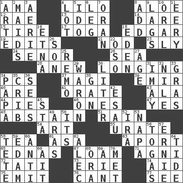 ACROSS 1. Nanny (var.) 4. _ and Stitch 8. _ vera 12. Actress Charlotte 13. Baltic tributary 14. Have the gumption 15. Become fatigued 17. Ancient Roman robe 18. _ Allan Poe 19. Prepares for publication 21. Dreamland 23. Secret 24. Sir (Sp.) 26. Ocean 28. Afresh 30. Yearning 34. Personal Computers (abbr.) 37. Wise men 39. Arab leader 40. "We ___ not amused" (Victoria) 41. Speak pompously 43. Insect wing 44. Sliced desserts 46. Singles 47. Consenting reply 48. Refrain by choice 51. Precipitation 54. Nonscientific branch of learning 55. A salt of uric acid 58. Beverage made from leaves 61. White ___ sheet 63. To the left, to Queeg 65. Ferber et al. 67. Rich soil 71. Hindu god of fire 72. Jacques of French films 73. One of the Great Lakes 74. Help 75. Give off 76. Patter 77. Observe DOWN 1. Johnson of "Laugh-In" 2. Unmarried girls 3. Nest on high 4. Car dealer's back yard 5. Wedding promise 6. Part of a journey 7. NW Algerian seaport 8. Increase 9. Fails to keep up a pace 10. Spoken 11. Suggestive of the supernatural 16. Inactive volcano in Sicily 18. Genesis locale 20. Male offspring 22. Bear (Spanish) 25. San ____ (Riviera town) 27. Mature 29. Make _____ (do battle with) 30. 61 cubic inches 31. "If ____ say so..." 32. Mediterranean tributary 33. Pate de foie ____ 34. Dad 35. Baby bed with high sides 36. Perceives with the eye 38. Separate the seeds from cotton 42. Son of Isaac 45. R.R. building 49. Caspian sea tributary 50. ___ a Wonderful Life 52. Retirement account (abbr.) 53. California wine valley 56. Ancient Roman robes 57. Bert's buddy 58. False hair 59. Dutch treat 60. Against 62. Actor Baldwin 64. Periodic rise and fall of the sea level 66. Small island 68. Mouth or opening 69. The 18th letter of the Arabic alphabet 70. Was introduced to