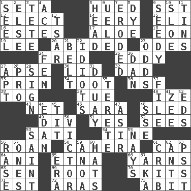 ACROSS 1. Bristle 5. Took on color 9. Fast jet (abbr.) 12. Voters do this 14. Suggestive of the supernatural 15. Connecticut Ivy Leaguer 16. _____ Park, CO 17. _ vera 18. A really long time 19. Area sheltered from the wind 20. Remained 23. Lyric poems 24. Flintstone 25. Whirlpool 27. Domed church section 30. Flaplike covering 32. Male parent 33. Demure 34. A blast of a horn 36. Science/research agcy. 38. Coat; cloak 39. Third day of the wk. 40. Ending with capital 43. Fish or hair follower 46. "Two Mules for Sister ____" 48. Downhill vehicle 49. HTML Container Element 51. It is so 52. Observes 53. Suttee (variant) 54. Prong on a fork 56. Wander aimlessly 58. Device for capturing images 61. Head covering 64. Black tropical American cuckoo 65. Inactive volcano in Sicily 66. Entertaining tales 68. Elected rep. 69. Carrot, for example 70. Burlesque acts 71. Eastern Standard Time (abbr.) 72. Ancient river in northeast Turkey 73. "This won't hurt ____!" DOWN 1. Sew up the eyelids of hawks and falcons 2. Otherwise 3. False hair 4. Adept person 5. Froth on beer 6. Ubangi River tributary 7. Worn away 8. Color 9. Sleazy 10. A type of plum 11. Metal containers 13. Russian ruler of old 21. Waist strap 22. Foolish or stupid persons 23. Likelihood 24. Opposite of masc. 26. One of the 12 tribes of Israel 27. Fitting 28. Adept person 29. Omen 31. A city in N France, SE of Calais 35. Cigar-shaped 37. Do some clerical work 41. Last letter of the English alphabet 42. Begley and Asner 44. Dutch treat 45. Teat (slang) 47. SW Saudi Arabia district 48. Compass dir. 50. Winning man's name 53. Virtuous person 55. Negative votes 56. Raze (variant) 57. Washington bills 59. Small Philippine buffalo 60. Floor protectors 61. Baby bed with high sides 62. Against 63. Inconspicuous attention getter 65. Period 67. Alias (abbr.)
