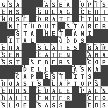 ACROSS 1. Girls' org. (abbr.) 4. At sea 8. Chooses 12. Followers of ems 13. POW camp 14. An absolute certainty 15. Characteristic smell of wine 17. Declaim 18. Needle case 19. Sans 21. A viewer who gazes fixedly 23. R.R. building 24. Was introduced to 26. Cuckoo 27. Slanted text style (abbr.) 28. Likelihood 30. Period 31. Chalkboards 34. Tavern 37. Elected rep. 38. Ingested 39. Santa ___, CA 40. Fast jet (abbr.) 41. Spring feasts 42. Police officer (slang) 43. Small valley 44. "____ silly question..." 46. Head covering 47. Eastern Standard Time (abbr.) 50. ___ a Wonderful Life 51. Ridicules or criticizes harshly 54. Portable computers 57. Blunders 58. Peak District village in England 60. Friends 62. Indonesian resort city 63. Keyboard key 64. Corporate head (abbr.) 65. _ gin 66. Backtalk 67. Begley and Asner DOWN 1. Commissioned mil. rank 2. Overwhelm 3. Helper 4. Gold (Symbol: Au) 5. Schedule 6. Consume 7. Eras 8. Seas 9. _ dish (used to culture cells) 10. Loyal 11. Commotion 13. Thick or sticky substance 16. Singer James 20. Actor Linden 22. Bits 25. Carrier 27. Angers 29. Hiding places for outlaws 30. Curvy letter 31. Stitch closed the eyes of (a falcon) 32. Dipping utensil 33. Had dinner 34. Keyboard key 35. Small Philippine buffalo 36. Strike 41. Back-to-school mo. 43. Hyrax 44. Small island 45. Discontinue 46. Monte _, Las Vegas Hotel/Casino 48. Narrow boards 49. Falsehoods 51. Confederate soldiers (slang) 52. Relating to the mouth 53. Perceives with the eye 55. For each 56. Downhill vehicle 59. Heredity factor (abbr.) 61. Mayday