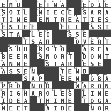 ACROSS 1. Australian flightless bird 4. Inactive volcano in Sicily 8. Singer Brickell 12. Land 14. Sibling's daughter 16. "Two Mules for Sister ____" 17. Prong on a fork 18. Pleas 20. First name in cosmetics 22. Pipe bend 23. Fast jet (abbr.) 24. R.R. building 25. Luau accessory 28. Compass dir. 30. Russian ruler of old 31. Unconcealed 35. Quiet! 37. Printing process, for short 40. Type of rug 41. Fermented drink made from hops 42. Derisive sound 44. Do not 45. Queen of England 1702-14 46. Play the lead 47. Compass dir. 48. NE Netherlands city 50. Watch over 52. Plant excrement 54. Car or cant ending 55. Chief or king in Benin or Nigeria 58. Adept person 61. Allow head to fall sleepily 63. Make _____ (do battle with) 65. Frustrating wastes of time 70. Actor's bit 71. It may be bright or harebrained 72. One or ones belonging to thee 73. Ancient Roman robe 74. Confront 75. Assistant 76. Not either DOWN 1. _____ Park, CO 2. Damp 3. National forest in Provo, Utah 4. Compass dir. 5. Metal container 6. Fish or hair follower 7. Measure of real estate 8. Eastern Standard Time (abbr.) 9. Raised platform 10. Angers 11. Compass direction 13. Area sheltered from the wind 15. Snakelike fish 19. In addition 21. Raised railways 26. Hearing organs 27. Metal shackles 29. Dodged 30. Threesomes 32. Greek god of love 33. French philosopher Descartes 34. Make lace 35. Elected reps. 36. Coop moms 38. Small child 39. Speak pompously 41. Sound made by sheep 43. Relationship diagram 49. Grandmother 51. Compass dir. 53. Sweet dark-red dessert wine 55. Greek mythologigal hunter 56. Beat drum 57. Approach 58. Demure 59. Travel on an animal 60. Double curve, resembling the letter S 62. Capital of the state of Qatar 64. The first octave above the treble staff 66. Floor protector 67. Cards in a Roman deck? 68. Conclusion 69. Observe