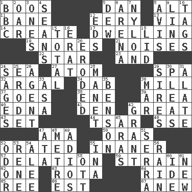 ACROSS 1. Expressions of contempt or scorn 5. One of the 12 tribes of Israel 8. Keyboard modifier key 11. Object of repulsion 12. Suggestive of the supernatural 13. By way of 14. Cause to be 17. Residence 19. Sounds asleep 21. Annoying sounds 22. Play the lead 23. Also 24. Ocean 27. Smallest unit of an element 29. Health resort 32. Therefore, facetiously 34. Apply (a substance) by light strokes 36. Place where flour is made 37. Moves 38. Compass dir. 39. Type of rug 40. Pulitzer Prize-winning author Ferber 41. Lair 42. Relatively large 43. Arrange properly for use 44. Russian ruler of old 46. Compass dir. 47. Wet nurse (var.) 50. Mouths or openings 52. Spoke pompously 55. Sillier 57. Conveyance 59. Put through a sieve 62. Single 63. Roll call or roster of names 64. Travel on or in a vehicle 65. To riddle 66. Eastern Standard Time (abbr.) 67. Afresh DOWN 1. English channel? 2. Boat paddle 3. Washington bills 4. Actors Connery and Penn 5. Morning condensation 6. Sports stadium 7. High-strength synthetic material 8. Deliberation 9. Actor's bit 10. Labels 12. Begley and Asner 15. Add up to 16. Part of Q.E.F. 18. Flaplike covering 20. Worn away 24. Gurus 25. Wear away 26. Representative 28. French painter Edouard 29. Fathers 30. Entreaties 31. Having winglike extensions 33. White ___ sheet 35. Gillaume's butler role 36. Third mo. 42. Let have 45. Ancient river in northeast Turkey 47. _ moment's notice (2 wds.) 48. Distance measurement (Brit.) 49. Goodbye (Sp.) 51. Father Junipero _ 52. Aroma 53. French philosopher Descartes 54. Toward shelter 55. _ tizzy (2 wds.) 56. Water falling in drops from the sky 58. Baseball player Mel 60. Binary compound 61. ___ Haven, CT