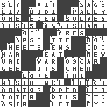 ACROSS 1. Mischievous 4. Small island 7. Settles 11. 54 in ancient Rome 12. "You Light Up My Life" star Conn 13. Friendly 14. Single 15. Locale of original sin 16. Finds the solution 17. Trials 19. Aide 21. Petroleum 23. Ancient Greek god of war 24. Domed church section 25. Neckwear 26. Spanish title 29. Confronts 30. Followers of ems 31. Wedding promise 32. Spoil 33. Erode 34. ___ Haven, CT 35. RI univ. 36. Armed conflict 37. Motion picture award 40. Turn to the right 41. ___ a Wonderful Life 42. "Mermaids" star 43. Old wives' tales, e.g. 45. Three (prefix) 46. Home 51. Choose 55. Speaker 56. Wrote a lyric poem 58. Cards in a Roman deck? 59. Carrier 60. Petroleums 61. It would 62. SW Saudi Arabia district 63. Flowery wreath 64. Sight organ DOWN 1. Notch 2. Actor's bit 3. Jacques Cousteau's middle name 4. Assist 5. The main thing one is thinking about 6. Metal containers 7. Table seasonings 8. Inventor's middle name 9. Small, secluded valley 10. System (abbr.) 12. Cease 13. Airs 16. Begets 18. Drink excessively 20. Inhabitant of Heaven 22. French article 24. Nest on high 25. Pulls apart 26. Middle Eastern gold or silver currency 27. River in Europe 28. At this time 29. Female horse 32. Large cup 33. Ingested 36. One who wires 37. Sep. follower 38. Fragments 39. To provide with a ceiling 43. 61 cubic inches 44. Aroma 46. Round or rotation of duties 47. Greek god of love 48. Suttee (variant) 49. Calm and collected 50. Singer Brickell 52. Writer Wiesel 53. Municipality 54. Periodic rise and fall of the sea level 57. Connecticut Ivy Leaguer