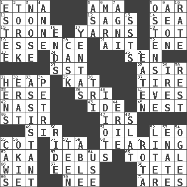 ACROSS 1. Inactive volcano in Sicily 5. Nanny (var.) 8. Boat paddle 11. Within a short period 12. Droops 14. Ocean 15. Heavy duty weighing machine 17. Entertaining tales 18. Small child 19. Center 21. Small island 22. Compass dir. 23. Supplement with great effort 24. Daniel's nick name 25. Elected rep. 27. Fast jet (abbr.) 28. SW Saudi Arabia district 31. Pile 35. Krazy ___ of comics 37. Hoop that covers a wheel 38. Celtic language 39. Indian title of respect (Mr.) 41. Nights before holidays 42. Political cartoonist Thomas 43. Binary compound 45. Egg locale 46. Commotion 47. Big collection agency 49. Title for a knight 51. Petroleum 52. Lion 55. Small bed 57. Call ___ day 60. Separating forcefully 62. Alias (abbr.) 63. Alight from a bus 65. Add up to 66. Victory 67. Snakelike fish 68. Wig 69. Put into a specified state 70. Born 71. Ancient Greek god of war DOWN 1. First name in cosmetics 2. Cod relative 3. Trap for birds or small mammals 4. Queen of England 1702-14 5. White ___ sheet 6. Hindu Mythology: god of death 7. Hindu god of fire 8. Clearly or manifestly demonstrative 9. Period of immesurable duration 10. Assign a rank or rating to 13. Fast planes 16. Extremities 17. Gossips 20. Keg 26. Ingested 29. Angers 30. State of inaction 31. Coop moms 32. Part of Q.E.F. 33. Aide 34. _ dish (used to culture cells) 36. Three (prefix) 40. Foolish or stupid persons 44. One of the Great Lakes 48. Narrow board 50. Travel on or in a vehicle 52. 61 cubic inches 53. Maternal 54. Stares 55. Crow sounds 56. Migrant worker of the '30s 58. Adolescent 59. Competent 61. Round or rotation of duties 64. Purpose