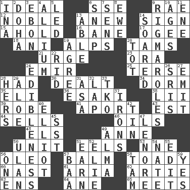 ACROSS 1. Perfect 6. Compass dir. 9. Actress Charlotte 12. Having high moral qualities 13. Afresh 14. Omen 15. Hold, grip (Informal) 16. Object of repulsion 17. Double curve, resembling the letter S 18. Black tropical American cuckoo 19. High mountains 20. Scottish caps 21. Goad 23. Mouth or opening 24. Independent ruler or chieftain 25. Laconic 28. Possessed 30. Started a card game 34. Dormintory (informal) 35. Connecticut Ivy Leaguer 36. 1973 Nobel Price Winner (Physics) Leo 38. Cards in a Roman deck? 39. Loose flowing garment 41. To the left, to Queeg 43. Eastern Standard Time (abbr.) 44. Makes a sale 46. Lubricates 48. Raised railways 49. Singer Murray 50. A single undivided whole 51. Snakelike fish 53. Compass dir. 56. Butter sub 57. Lip ointment 58. Sycophant 60. Political cartoonist Thomas 61. Roberta Peters solo 62. Nick name for Arthur 63. Followers of ems 64. A saturated hydrocarbon 65. Confronts DOWN 1. _ tizzy (2 wds.) 2. Capital of the state of Qatar 3. Inky black, to poets 4. Plant genus of onion and garlic 5. Directed 6. Fastener 7. Elected reps. 8. She-sheep 9. Complicated, petty procedures 10. Ripens 11. Compass dir. 13. Competent 14. Flew 19. Match 20. Small child 22. To free from 24. The property of being fit to eat 26. Indian titles of respect 27. Send forth 28. Possessive pronoun 29. _ vera 31. White ___ sheet 32. Infant locale 33. Ring climax 37. Removes the wrinkles 40. American author Paul (1891-1958) 42. Metal container 45. Fast jet (abbr.) 47. Poe poem 49. _ mater 50. ____ Bator, Mongolia 51. Merit 52. Writer Wiesel 54. Nathan's nickname 55. Prepare for publication 56. Single 57. Sound made by sheep 58. Scottish cap 59. Affirmative reply