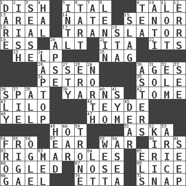 ACROSS 1. Food container 5. Slanted text style (abbr.) 9. Story 13. Type of rug 14. Nathan's nickname 15. Sir (Sp.) 16. Monetary unit of Yemen 17. Interpreter 19. Double-curved letter 20. The first octave above the treble staff 21. Call ___ day 22. ___ a Wonderful Life 23. Assist 25. Tired old horse 26. NE Netherlands city 30. Eras 34. Stone: prefix 35. Not divided or shared with others 36. Argument over a trivial matter 39. Entertaining tales 42. Heavy book 43. _ and Stitch 44. Miss Universe 1986, Barbara Palacios _ 46. Sharp bark 47. Simpsons dad 48. Being at a high temperature 51. "____ silly question..." 54. Back 57. Hearing organ 58. Armed conflict 60. Big collection agency 62. Complicated, petty procedures 65. 4th largest of the Great Lakes 66. Stared 67. Sense of smell 68. Louse (plural) 69. Highlander 70. Singer James 71. Fastener DOWN 1. Have the gumption 2. From or relating to Ireland 3. Gospel singer Marvin 4. Actor Linden 5. International (abbr.) 6. Small pie 7. _ moment's notice (2 wds.) 8. Soviet premier 1918-24 9. Afternoon social gathering 10. Opposed to 11. Spoils 12. Blunders 15. Volcanic refuse 18. R.R. building 20. Domed church section 24. Portable computer 27. Filthy place 28. Epoch 29. 0 degrees 30. Michaelmas daisies 31. Thick or sticky substance 32. Shade tree 33. Perceive with the eye 36. Mischievous 37. Sliced dessert 38. Everything 40. Modern: prefix 41. Symbol (abbr.) 45. Letter starter 48. Froth on beer 49. Boat paddle 50. Marketplace scale 52. Japanese brewing company 53. N. Chile seaport 54. Toadlike animal 55. Port city in Latvia 56. Stare 58. 270 degrees 59. At sea 61. Ooze 63. Cartoonist voice _ Blanc 64. Car dealer's back yard 65. Raised railways