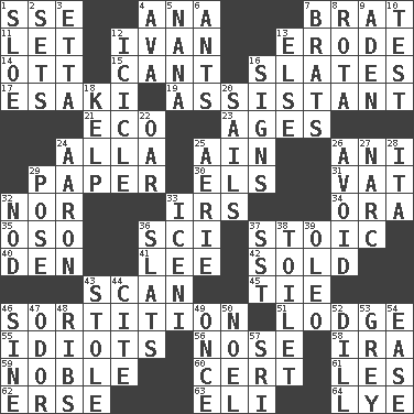 ACROSS 1. Compass dir. 4. Santa ___, CA 7. Naughty child 11. Allow 12. _ the terrible 13. Eat (away) 14. Baseball player Mel 15. Patter 16. Chalkboards 17. 1973 Nobel Price Winner (Physics) Leo 19. Aide 21. Environmental prefix 23. Ripens 24. Silent film actress Nazimova 25. The 18th letter of the Arabic alphabet 26. Black tropical American cuckoo 29. Some stationery 30. Raised railways 31. Large container 32. Or not 33. Big collection agency 34. Mouth or opening 35. Bear (Spanish) 36. _-fi 37. Unemotional 40. Lair 41. Area sheltered from the wind 42. Exchanged or delivered for money 43. Glance over 45. Make a knot 46. Making a chance decision by using lots 51. Cabin 55. Foolish or stupid persons 56. Olfactory organ 58. Retirement account (abbr.) 59. Impressive in appearance 60. Sure thing 61. French article 62. Celtic language 63. Biblical high priest 64. Potassium hydroxide DOWN 1. _ gin 2. Puts into a specified state 3. Singer James 4. Actress Gardner 5. Nanny 6. Pismires 7. Naughty children 8. Round or rotation of duties 9. An important port of Yemen 10. Trial 12. Ice on the eave 13. Otherwise 16. Omens 18. Seaweed 20. Moves on water 22. Rowing implement 24. Composer Copland 25. Nest on high 26. Shun 27. Drug cop 28. Call ___ day 29. Airs 32. Dreamland 33. Ancient Celtic tribe of eastern Britain 36. Narrow boards 37. Fast jet (abbr.) 38. Rest room 39. Butter sub 43. Fur scarf 44. Quote 46. Trig term 47. Aroma 48. Teases 49. Single time 50. Christmas carol 52. Deli pickle 53. Jennifer or Joel 54. Relaxation 57. Indian title of respect (Mr.)