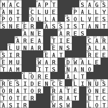 ACROSS 1. Apple computer (short form) 4. Fitting 7. Sinks 11. Black tropical American cuckoo 12. A slight indication 13. Chummy 14. Cooking vessel 15. Rounded earthenware pot or jar 16. Finds the solution 17. Contemptuous expression 19. Helper 21. One (Scot) 23. Ancient Greek god of war 24. Length times width 25. Make a knot 26. 4-wheeled motor vehicle 29. Type of eclipse 30. Followers of ems 31. Wing 32. Title for a knight 33. Ingest 34. Portuguese money of account (variant) 35. Australian flightless bird 36. Armed conflict 37. A sleeping potion; an opiate (poet.) 40. Scottish cap 41. ___ a Wonderful Life 42. Billionth: prefix 43. Old wives' tales, e.g. 45. The first octave above the treble staff 46. Home 51. "_ and Lucy" (Charlie Brown theme song) 55. Speaker 56. Assign a rank or rating to 58. Single 59. Carrier 60. Part of Q.E.F. 61. And so on (abbr.) 62. SW Saudi Arabia district 63. Compass dir. 64. Car dealer's back yard DOWN 1. Atlas contents 2. Soon (poet.) 3. Quote 4. Everything 5. Monetary unit of Botswana 6. Afternoon social gatherings 7. Table seasonings 8. Inventor's middle name 9. Small, secluded valley 10. System (abbr.) 12. Pupil covering 13. Introduce or present, as a question 16. Fathers 18. Merit 20. Inhabitant of Heaven 22. Hearing organ 24. Gold (Symbol: Au) 25. Pulls apart 26. Monte _, Las Vegas Hotel/Casino 27. Toward shelter 28. Actress Charlotte 29. Pale green bean 32. Arrange properly for use 33. Consumed 36. One who wires 37. Heredity factor (abbr.) 38. Place for singles 39. Against 43. 61 cubic inches 44. Aroma 46. Roll call or roster of names 47. Greek god of love 48. Suttee (variant) 49. Ship's personnel 50. Hearing organs 52. Christmas carol 53. To (old English) 54. Religious group 57. The 23rd letter of the Hebrew alphabet