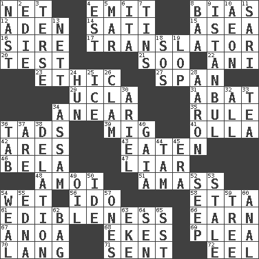 ACROSS 1. Fish or hair follower 4. Give off 8. Prejudice 12. An important port of Yemen 14. Suttee (variant) 15. At sea 16. Title for a man of rank and authority 17. Interpreter 20. Trial 21. "Barney Miller" actor Jack 22. Cuckoo 23. Value system 27. Connect, as a bridge 29. Southern CA. univ. 31. Blind as ____ 34. Approach 35. Governing power 36. Small boys 39. Russian fighter aircraft 41. Spanish pot 42. Ancient Greek god of war 43. Eroded 46. Actor Lugosi 47. One who doesn't tell the truth 48. Mine, in Marseilles 51. Collect or gather 54. Soggy 56. Wedding promise 58. Singer James 61. The property of being fit to eat 66. Merit 67. Small Philippine buffalo 68. Makes supply last 69. Entreaty 70. Austrian-born American filmmaker Fritz 71. Posted 72. Snakelike fish DOWN 1. Political cartoonist Thomas 2. Singer Brickell 3. Laconic 4. Eastern Standard Time (abbr.) 5. Make imperfect 6. Call ___ day 7. Metal containers 8. Sound made by sheep 9. Byzantium, centuries later 10. Age 11. Indian skirt 13. Remaining after all deductions 18. Mayday 19. Chop off 24. Attila the _ 25. Frozen water 26. Dollar (slang) 28. Composer Copland 30. Satellite of Uranus 32. Everything 33. Afternoon social gathering 34. Indian state 36. Bar bill 37. "We ___ not amused" (Victoria) 38. Conveyance 40. Greek goddess of the earth (variant) 44. Scottish cap 45. Epoch 49. Petroleum 50. Binary compound 52. Ooze 53. Showing deterioration from age 54. Welt 55. Pulitzer Prize-winning author Ferber 57. Singles 59. Relationship diagram 60. Of or related to the anus 62. Container for groceries 63. Supplement with great effort 64. Elected rep. 65. Fast jet (abbr.)