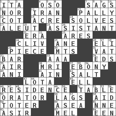 ACROSS 1. Call ___ day 4. Bear (Spanish) 7. Sinks 11. And not 12. SW Asia republic 13. Chummy 14. Small bed 15. 43,560 square feet 16. Finds the solution 17. Native American of Southwest Alaska 19. Helper 21. Period 23. Ancient Greek god of war 24. 154 in Roman numerals 25. One (Scot) 26. Connecticut Ivy Leaguer 29. Component 30. Mountains (abbr.) 31. Large container 32. Soap unit 33. American Automobile Association (abbr.) 34. Begley and Asner 35. Atmosphere 36. Medical imaging device (abbr.) 37. Black 40. Cuckoo 41. The 18th letter of the Arabic alphabet 42. Table seasoning 43. Globular water bottle used in Asia 45. Pipe bend 46. Home 51. Eating place 55. Speaker 56. Fails to keep up a pace 58. Help 59. Carrier 60. Toward the sea 61. Compass dir. 62. SW Saudi Arabia district 63. Cartoonist voice _ Blanc 64. Car or cant ending DOWN 1. South American Indian 2. Utensil 3. Johnson of "Laugh-In" 4. The grampus (Milton) 5. "Two Mules for Sister ____" 6. Washington bills 7. Table seasonings 8. Inventor's middle name 9. Small, secluded valley 10. System (abbr.) 12. Of or pertaining to medicine 13. Airs 16. Male parents of animals 18. Ubangi River tributary 20. Before Barbara or Clara 22. "___ Maria" 24. High-altitude cloud 25. At full speed 26. Happening 27. Kenny Rogers chart-topper in '80 28. It is 29. Ache 32. Sound made by sheep 33. Believer in; advocate of (suffix) 36. Mother 37. Compass dir. 38. Greek mezzo-soprano Agnes 39. Spanish pot 43. 61 cubic inches 44. Aroma 46. Round or rotation of duties 47. Greek god of love 48. Suttee (variant) 49. Burrowing marine mollusk 50. Comfort 52. Object of repulsion 53. Actor's bit 54. Genesis locale 57. Set