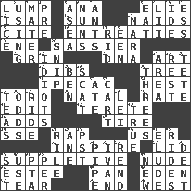 ACROSS 1. Mass 5. Santa ___, CA 8. Writer Wiesel 12. Austrian river, tributary to the Danube 13. Player for Phoenix 14. Unmarried girls 15. Quote 16. Pleas 19. Compass dir. 20. More impudent 21. Smile widely 23. Heredity factor (abbr.) 24. Nonscientific branch of learning 27. Claim 30. Relationship diagram 31. Medicinal drug used to evoke vomiting 34. Command 35. "Corrida" creature 38. Relating to or accompanying birth 40. Assign a rank or rating to 41. Prepare for publication 42. Cylindrical with tapered ends 44. Sums up 45. Hoop that covers a wheel 46. Compass dir. 47. Reproach for some lapse or misdeed 50. One who uses or employs something 53. Heighten or intensify 57. Flaplike covering 59. Supplying deficiencies 63. Naked 64. First name in cosmetics 65. Baking dish 66. Paradise 67. Pull into pieces 68. Conclude 69. Compass direction DOWN 1. Louse (plural) 2. Exploiting 3. Mother 4. Before (prefix) 5. Toward the sea 6. Religious women 7. Pismires 8. Ingest 9. Cards in a Roman deck? 10. Binary compound 11. Curvy letter 14. Hindu Mythology: god of death 17. To free from 18. Car or cant ending 20. Sever or remove by pinching or nipping 22. Foolish or stupid persons 24. Length times width 25. Relief 26. Wig 28. Benjamin's nick name 29. Scram! 30. Triads 32. Had dinner 33. Heavy open wagon 35. Beverages made from leaves 36. Probability 37. Travel on an animal 39. Flowery wreath 43. Loyal 47. Cause heat under the collar 48. A saturated hydrocarbon 49. Pacific Standard Time (abbr.) 51. Evade 52. Amusement-park features 54. Corncob 55. _ the terrible 56. Tear apart 58. Scratch 59. Arrange properly for use 60. Purpose 61. Parent Teacher Association (abbr.) 62. For each 63. ___ Haven, CT