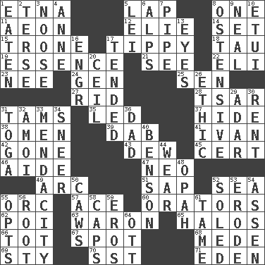 ACROSS 1. Inactive volcano in Sicily 5. Pet locale 8. Single 11. Age 12. Writer Wiesel 14. Put into a specified state 15. Heavy duty weighing machine 17. Likely to tip or tilt 18. The 19th letter of the Greek alphabet 19. Substance 21. Perceive with the eye 22. Biblical high priest 23. Born 24. Commissioned mil. rank 25. Elected rep. 27. To free from 28. Russian ruler of old 31. Scottish caps 35. Directed 37. Flintstone garb 38. Presage 39. Pat or tap gently 41. "Terrible" tsar 42. Went 43. Morning condensation 45. An absolute certainty 46. Assistant 47. Modern: prefix 49. Curve 51. Plant excrement 52. Ocean 55. The grampus (Milton) 57. Adept person 60. Speakers 62. Luau course 63. Make _____ (do battle with) 65. Radiant circles of light 66. Small child 67. Specific locale 68. Ancient Persian 69. Filthy place 70. Fast jet (abbr.) 71. Paradise DOWN 1. Consumed 2. Laconic 3. Trap for birds or small mammals 4. Singer Murray 5. Luau accessory 6. High mountains 7. Corncob 8. Clearly or manifestly demonstrative 9. Be tempered by heat 10. Needle case 13. Sight organs 16. Engineer (abbr.) 17. Watched over 20. To provide with a ceiling 26. Principle of right and wrong 29. The sixth month of the Jewish calendar 30. Monthly bill 31. Ancient Roman robe 32. Mine, in Marseilles 33. Ananias' fault 34. Contemptuous expression 36. Male parent 40. Gillaume's butler role 44. Put on (as clothing) 48. Brightly colored fish 50. Crow sounds 52. Having a sole or soles 53. Wear away 54. NE Netherlands city 55. Elects 56. Carrot, for example 58. Balmoral and tarboosh 59. Greek god of love 61. Docile 64. Baseball player Mel