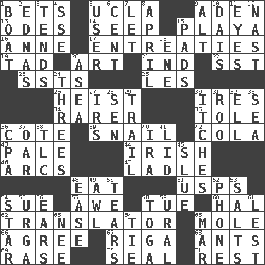 ACROSS 1. Wagers 5. Southern CA. univ. 9. An important port of Yemen 13. Lyric poems 14. Ooze 15. Beach, in Buenos Aires 16. Queen of England 1702-14 17. Pleas 19. Small amount or degree 20. Nonscientific branch of learning 21. Indiana (abbr.) 22. Fast jet (abbr.) 23. Fast planes 25. French article 26. Robbery 30. Angers 34. More valued for its uncommonness 35. Lacquered or enameled metalware 36. ____ d'Azur (French Riviera) 39. Slow-paced one 42. Root beer relative 43. Diluted with white 44. From or relating to Ireland 46. Curves 47. Dipping utensil 48. Ingest 51. United States Postal Service (abbr.) 54. Institute legal proceedings 57. Deep reverence 58. Third day of the wk. 60. Actor Linden 62. Interpreter 65. Undercover agent 66. Match 67. Capital of Latvia 68. Pismires 69. Raze (variant) 70. Lick closed 71. Remainder DOWN 1. Water vessel 2. Ferber et al. 3. Is inclined (to) 4. Compass dir. 5. One who uses or employs something 6. Penny 7. Allow 8. Showery time 9. Keyboard modifier key 10. Raised platform 11. Snake ____ (dice throw) 12. Political cartoonist Thomas 15. Groovy apts. 18. Compass dir. 20. Toward the sea 24. Threesomes 27. Big collection agency 28. Elected rep. 29. Get behind 30. Strong, restless desires 31. Friend of Pooh 32. Pipe bend 33. Ocean 36. Accounting whiz (abbr.) 37. Boat paddle 38. Affectionate concern, for short 40. Retirement account (abbr.) 41. Flaplike covering 45. Change direction abruptly 48. Comfort 49. Leather borer 50. Lacerates 52. Give a jingle 53. Table seasonings 54. Play the lead 55. Capital and largest city of Mongolia 56. Hearing organs 58. Ancient Roman robe 59. Mountain range 61. For fear that 63. Born 64. Neckwear 65. Impair