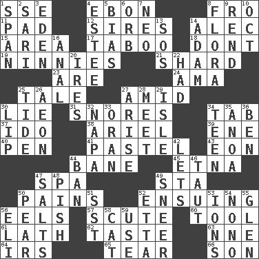 ACROSS 1. Compass dir. 4. Inky black, to poets 8. Away 11. Writing tablet 12. Titles for men of rank and authority 14. Actor Baldwin 15. Length times width 17. Off limits 18. Do not 19. Fools 21. Broken piece 23. "We ___ not amused" (Victoria) 24. Housemaid (var.) 25. Lie 27. Among 30. Falsehood 31. Sounds asleep 34. Bar bill 37. Wedding promise 38. Satellite of Uranus 39. Compass dir. 40. Animal enclosure 41. Soft color 43. Age 44. Object of repulsion 45. Inactive volcano in Sicily 47. Health resort 49. R.R. building 50. Aches 52. Taking place subsequently 56. Snakelike fish 57. Turtle shell scale 60. Implement 61. Thin strip of wood or metal 62. Clothes sense 63. Compass dir. 64. Big collection agency 65. Rend 66. Manchild DOWN 1. Connect, as a bridge 2. Indian skirt 3. Locale of original sin 4. First name in cosmetics 5. Prejudice 6. Globe 7. Modern: prefix 8. Plants 9. Tear apart 10. Sep. follower 13. Distress signal 14. First man 16. Of or related to the anus 20. Angers 22. Possessed 25. Event that recurs at intervals 26. Age 27. Get up 28. Confront 29. Small island 30. Mouth edge 32. California wine valley 33. Northwest Algerian city 34. Adolescent 35. Small Philippine buffalo 36. Benjamin's nick name 42. Allows 44. Prohibit 46. Drawn tight 47. Table seasonings 48. Expression of disdain 49. Scornful expression 50. Lightbulb-shaped fruit 51. Fast jet (abbr.) 52. Singer James 53. Charged atoms 54. Words to Nanette 55. Small, secluded valley 56. Connecticut Ivy Leaguer 58. Feline 59. Purpose