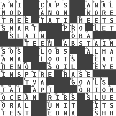 ACROSS 1. Cuckoo 4. Smile enhancers 8. Of or related to the anus 12. Allow head to fall sleepily 13. Soon (poet.) 14. Had on 15. Woody plant 17. Jacques of French films 18. Confronts 19. Don Adams' spy role 21. Adept person 23. Allow 24. Killed 26. Chief or king in Benin or Nigeria 28. Adolescent 30. Choose not to consume 34. Mayday 37. Tennis shots 39. _ mater 40. Wet nurse (var.) 41. Plunders 43. Erode 44. Western Nevada city 46. Land 47. Sight organ 48. Stimulate to action 51. Raze (variant) 54. Federal power corp. 55. Scores awarded for successful feats 58. Make lace 61. Fitting 63. Constellation of myth 65. Sea 67. Teases 71. Change direction abruptly 72. Of the mouth 73. A single undivided whole 74. It is 75. Trial 76. Pulitzer Prize-winning author Ferber 77. Quiet! DOWN 1. Pismires 2. Typical models 3. Perfect 4. Feline 5. Santa ___, CA 6. Cooking vessel 7. Sever or remove by pinching or nipping 8. Deep reverence 9. Christmas carol 10. Johnson of "Laugh-In" 11. For fear that 16. Part of Q.E.F. 18. Crowds into 20. Standoff 22. Director Reiner 25. 1994 drama film starring Jodie Foster 27. _ moment's notice (2 wds.) 29. Trap for birds or small mammals 30. Being in motion 31. Toward shelter 32. "If ____ say so..." 33. Nathan's nickname 34. Indian skirt 35. Presage 36. Without 38. Sometimes accompanies a hiss 42. Volcanic refuse 45. Choose 49. "Terrible" tsar 50. Strike 52. "Barney Miller" actor Jack 53. Hearing organs 56. Ms. Damita and namesakes 57. _ pole 58. A blast of a horn 59. 1/640 square mile 60. Afternoon social gatherings 62. Loyal 64. Tender 66. The first octave above the treble staff 68. Indiana (abbr.) 69. Storage container 70. R.R. building