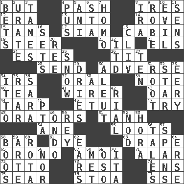 ACROSS 1. With the exception that 4. Romantic infatuation 8. Angers 12. Epoch 13. To (old English) 14. Be footloose 15. Scottish caps 17. Thailand, formerly 18. Small house or cottage 19. Bull 21. Petroleum 23. Raised railways 24. _____ Park, CO 26. Teat (slang) 28. Post 30. Contrary to your interests or welfare 34. Big collection agency 37. Relating to the mouth 39. Brief written record 40. Beverage made from leaves 41. One who wires 43. Boat paddle 44. Canvas cover 46. Needle case 47. Attempt to accomplish something 48. Speakers 51. Hyperbolic tangent 54. One (Scot) 55. Plunders 58. Drinking establishment 61. Color 63. Window treatment 65. U. of Maine site 67. Mine, in Marseilles 71. Having or resembling wings 72. Von Bismarck 73. Respite 74. Followers of ems 75. Wither 76. Portico 77. Compass dir. DOWN 1. Wagers 2. A salt of uric acid 3. Softens 4. Purulenc 5. Black tropical American cuckoo 6. R.R. building 7. Like (prefix) 8. Retirement account (abbr.) 9. Loose flowing garment 10. Tending to cause great harm 11. Elected reps. 16. Arranges properly for use 18. 154 in Roman numerals 20. To riddle 22. It would 25. Frozen precipitation 27. "___ Little Indians" 29. Frees from moisture 30. Eskimo relative 31. Carrot, for example 32. Play the lead 33. Suggestive of the supernatural 34. "Tell ____ the Marines!" 35. Buttocks 36. "Two Mules for Sister ____" 38. Tate display 42. Monetary unit of Yemen 45. Parent Teacher Association (abbr.) 49. Southwest Nigerian state 50. Marina Del _, California 52. Allow head to fall sleepily 53. Israeli folk dance 56. Falsehoods 57. Connects, as a bridge 58. Scornful sounds 59. Johnson of "Laugh-In" 60. Round or rotation of duties 62. Hearing organs 64. Celtic language 66. Not either 68. Was introduced to 69. Bear (Spanish) 70. Call ___ day