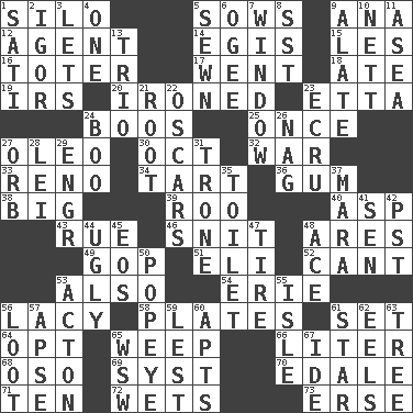 ACROSS 1. Grain storage tower 5. Sty mamas 9. Santa ___, CA 12. Representative 14. Armor plate that protects the chest 15. French article 16. Carrier 17. Left 18. Had dinner 19. Big collection agency 20. Pressed 23. Singer James 24. Scornful sounds 25. At one time in the past 27. Margarine 30. Sep. follower 32. Armed conflict 33. Former U.S. Attorney General Janet 34. Small pie 36. Chewing product 38. Massive 39. Friend of Pooh 40. Cleo's killer 43. Regret 46. In a ____ (agitated or irritated) 48. Ancient Greek god of war 49. Republican Party 51. Biblical high priest 52. Patter 53. In addition 54. One of the Great Lakes 56. Made of lace 58. Food holders 61. Arrange properly for use 64. Elect 65. Shed a tear 66. 61 cubic inches 68. Bear (Spanish) 69. System (abbr.) 70. Peak District village in England 71. Nine, plus one 72. Moistens 73. Celtic language DOWN 1. Suttee (variant) 2. Composer Stravinsky 3. Allows 4. Single 5. Stitched 6. Double curve, resembling the letter S 7. Light entry point 8. Fast jet (abbr.) 9. Having winglike extensions 10. Remaining after all deductions 11. Toward the sea 13. Musical group of three 21. Carrot, for example 22. Motion picture awards 23. Shade of tan 24. Surprise greeting 26. Tired old horse 27. Globe 28. Luau accessory 29. Engineer (abbr.) 31. Marketplace scale 35. Bathroom 37. Hindu Mythology: god of death 41. Elected rep. 42. Pacific Standard Time (abbr.) 44. Unsightly 45. Greek goddess of the dawn 47. Become fatigued 48. Adept person 50. Wimpy's pal 53. Gambison 55. Capri or Wright 56. Plunder 57. Domed church section 59. For fear that 60. Flats, for short 61. Play the lead 62. Snakelike fish 63. Relationship diagram 65. Compass dir. 67. Binary compound