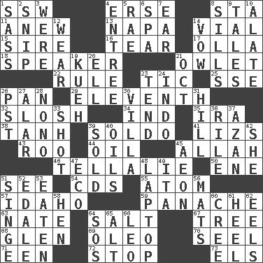 ACROSS 1. Compass dir. 4. Celtic language 8. R.R. building 11. Afresh 13. California wine valley 14. Small bottle 15. Title for a man of rank and authority 16. Rend 17. Spanish pot 18. Orator 21. A small or young owl 22. Governing power 23. Nervous spasm 25. Compass dir. 26. Baking dish 29. Veterans Day date 32. Agitate, as a liquid 34. Working for oneself (abbr.) 35. Retirement account (abbr.) 38. Hyperbolic tangent 39. Twentieth part of a lira 41. Belonging to Elizabeth 43. Friend of Pooh 44. Lubricate 45. Assad's deity 46. Copy Pinocchio 50. Compass dir. 51. Perceive with the eye 54. Music discs 55. Tiny particle 57. Potato state 59. Flamboyance 63. Nathan's nickname 64. Table seasoning 67. Relationship diagram 68. Small, secluded valley 69. Margarine 70. Stitch closed the eyes of (a falcon) 71. Car or cant ending 72. Obstruct or block passage 73. Raised railways DOWN 1. Backtalk 2. Sever or remove by pinching or nipping 3. Past tense of be (plural) 4. Main course 5. Actress Charlotte 6. Health resort 7. Hearing organ 8. Beverly of Met fame 9. Stories 10. Having winglike extensions 12. Put on (as clothing) 14. Solemn pledge 19. Malaysian steamed pastry 20. Pipe bend 21. Sep. follower 23. Look after 24. Southeast Asian peninsula 26. Pacific Standard Time (abbr.) 27. Having or resembling wings 28. Words to Nanette 30. Country residence 31. Land elevation 33. Went for two points 36. Cause heat under the collar 37. Muslim summons to prayer 39. Disposed of to a purchaser 40. Lubricates 42. A female animal or person 45. A really long time 47. Environmental prefix 48. Portable computer 49. Call ___ day 51. Burn superficially 52. Peak District village in England 53. Ingested 56. Floor coverings 58. Layer 60. Algonquian 61. The bottom of a shoe or boot 62. Snakelike fish 64. Mayday 65. Keyboard modifier key 66. Lion