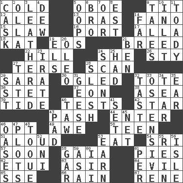 ACROSS 1. Lacking warmth 5. Mitch Miller's instrument 9. Teat (slang) 12. Toward shelter 13. Mouths or openings 14. Papal veil 15. Cole _ (cabbage dish) 16. Left side of a ship or aircraft 17. Silent film actress Nazimova 18. Krazy ___ of comics 19. Greek goddess of the dawn 21. A special lineage 22. Land elevation 24. A female animal or person 26. Filthy place 27. Laconic 28. Examine minutely or intensely 29. "Two Mules for Sister ____" 30. Stared at amorously 32. Haul 36. Proofreading order 37. Period of immesurable duration 38. Toward the sea 39. Event that recurs at intervals 40. Trials 42. Play the lead 43. Romantic infatuation 44. Keyboard key 46. Elect 49. Deep reverence 50. Adolescent 51. Verbally 53. Consume 54. Indian title of respect (Mr.) 57. Within a short period 58. Greek goddess of the earth (variant) 61. Sliced desserts 62. Needle case 63. SW Saudi Arabia district 64. Morally bad or wrong 65. Compass dir. 66. Water falling in drops from the sky 67. French philosopher Descartes DOWN 1. Keg 2. Rounded earthenware pot or jar 3. Resembling or made to resemble leather 4. Morning condensation 5. I made a mistake 6. Sis' sibling 7. Rowing implement 8. Eastern Standard Time (abbr.) 9. Stories 10. An arm off of a larger body of water 11. Sycophant 14. Distant 19. Raised railways 20. Butter sub 21. Benjamin's nick name 23. Feeling or showing extreme anger 24. Odor 25. Possessed 27. Jacques of French films 28. Make a splashing sound 29. Fast jet (abbr.) 31. Honkers 32. Clothes sense 33. Clearly or manifestly demonstrative 34. Separate forcefully 35. Ewer handle 40. The 23rd letter of the Hebrew alphabet 41. Bristle 43. Groovy apt. 45. Fish or hair follower 46. Fertile tracts in a desert 47. Secret plans 48. Woman's close-fitting hat 52. University (slang) 53. Merit 55. It's straight from the horse's mouth 56. Small island 58. Slender fish 59. White ___ sheet 60. One more than two 61. For each