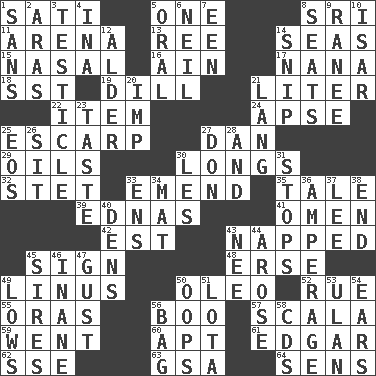 ACROSS 1. Suttee (variant) 5. Single 8. _ Lanka 11. Sports stadium 13. To sift 14. Oceans 15. Relating to the nose 16. The 18th letter of the Arabic alphabet 17. Grandmother 18. Fast jet (abbr.) 19. Deli pickle 21. 61 cubic inches 22. Detail 24. Domed church section 25. Fortification 27. One of the 12 tribes of Israel 29. Petroleums 30. Yearns 32. Proofreading order 33. Make improvements or corrections to 35. Lie 39. Ferber et al. 41. Sign of something about to happen 42. Eastern Standard Time (abbr.) 43. Slept 45. Signal 48. Celtic language 49. "_ and Lucy" (Charlie Brown theme song) 50. Margarine 52. Regret 55. Mouths or openings 56. Oct. 31 cry 57. Any of the three canals of the cochlea 59. Left 60. Fitting 61. _ Allan Poe 62. Compass dir. 63. Girls' org. (abbr.) 64. Elected reps. DOWN 1. Without 2. Caspian sea tributary 3. A testis 4. _ tizzy (2 wds.) 5. Spoken 6. Famous astronaut Armstrong 7. Car or cant ending 8. Theater features 9. The wife of a rajah (variant) 10. Austrian river, tributary to the Danube 12. Tree or shrub in the Birch family 14. Clip 20. Naughty child 21. Long (Scottish) 23. Clothes sense 25. Greek goddess of the dawn 26. Be seated 27. Spanish title 28. Also 30. French article 31. Closes up, plugs up 33. Followers of ems 34. Floor protector 36. Electrical Measurement 37. Area sheltered from the wind 38. Conclusion 40. Cub Scout units 43. Born 44. Came up 45. Founders of families 46. Empty; void 47. Abrupt rush of wind 49. Coldest temperatures 50. I made a mistake 51. Globular water bottle used in Asia 53. Uhlan (variant) 54. Hearing organs 56. Container for groceries 58. Music discs