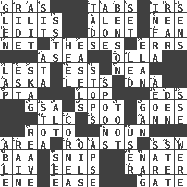 ACROSS 1. Pate de foie ____ 5. Bar bills 9. Big collection agency 12. Ms. Damita and namesakes 14. Toward shelter 15. Born 16. Proofreads 17. Do not 18. Avid follower 19. Fish or hair follower 20. College papers 23. Blunders 24. Toward the sea 25. Spanish pot 27. For fear that 30. Double-curved letter 32. Teachers' org. 33. "____ silly question..." 34. Allows 36. Heredity factor (abbr.) 38. Parent Teacher Association (abbr.) 39. Trim (branches) 40. Begley and Asner 43. Girls' org. (abbr.) 46. Blemish 48. Travels 49. Affectionate concern, for short 51. "Barney Miller" actor Jack 52. Queen of England 1702-14 53. Printing process, for short 54. Part of speech 56. Type of rug 58. Exposes to great heat 61. Compass dir. 64. Sound made by sheep 65. Sever or remove by pinching or nipping 66. Related on the mother's side 68. 54 in ancient Rome 69. Snakelike fish 70. More uncommon 71. Compass dir. 72. Comfort 73. Yard entry DOWN 1. Small, secluded valley 2. Travel on or in a vehicle 3. Came down and settled, as after flight 4. Be seated 5. Small boys 6. Medicinal plant 7. Gillaume's butler role 8. Put into a specified state 9. Kind of red light 10. Located in or toward the back 11. Elected reps. 13. Fast planes 21. The bottom of a shoe or boot 22. Artist's stands 23. Liveliness 24. "One Day ___ Time" 26. Directed 27. Pet locale 28. Eastern Standard Time (abbr.) 29. Heroin 31. Discontinues 35. Soup utensils 37. Age 41. Lair 42. Compass dir. 44. Portico 45. The first octave above the treble staff 47. A blast of a horn 48. Separate the seeds from cotton 50. Pupil covering 53. Break or tear apart 55. One who uses or employs something 56. Competent 57. Water falling in drops from the sky 59. Lubricates 60. Domed church section 61. "Two Mules for Sister ____" 62. Proofreading order 63. We are 65. Perceive with the eye 67. Tired old horse
