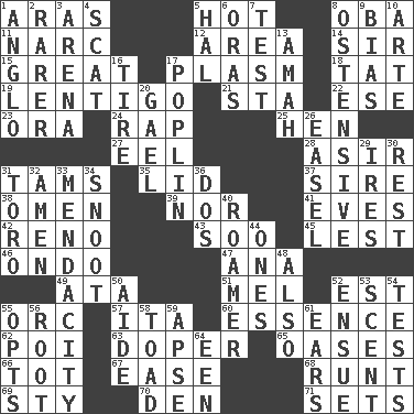 ACROSS 1. Ancient river in northeast Turkey 5. Being at a high temperature 8. Chief or king in Benin or Nigeria 11. Drug cop 12. Length times width 14. Title for a knight 15. Relatively large 17. Suffix with ecto or cyto 18. Make lace 19. Small, flat, pigmented spot on the skin 21. R.R. building 22. Compass dir. 23. Mouth or opening 24. Hit sharply and swiftly 25. Layer 27. Snakelike fish 28. SW Saudi Arabia district 31. Scottish caps 35. Flaplike covering 37. The founder of a family 38. Presage 39. Or not 41. Nights before holidays 42. Former U.S. Attorney General Janet 43. "Barney Miller" actor Jack 45. For fear that 46. Southwest Nigerian state 47. Santa ___, CA 49. "One Day ___ Time" 51. Cartoonist voice _ Blanc 52. Eastern Standard Time (abbr.) 55. The grampus (Milton) 57. Call ___ day 60. Gist 62. Luau course 63. Drug addict 65. Fertile tracts in a desert 66. Small child 67. Relaxation 68. The smallest animal of a litter 69. Filthy place 70. Lair 71. Puts into a specified state DOWN 1. White American of non-Hispanic descent 2. More valued for its uncommonness 3. Sports stadium 4. Scram! 5. Actor Linden 6. Mouths or openings 7. Trial 8. Clearly or manifestly demonstrative 9. Prejudice 10. Johnson of "Laugh-In" 13. Wet nurse 16. Become fatigued 17. Cotton for raincoats, e.g. 20. Highlander 26. Artist's stand 29. Angers 30. State of inaction 31. "Corrida" creature 32. So be it 33. Ananias' fault 34. Snout, nose 36. Two (Sp.) 40. Nomad 44. Washington bills 48. In addition 50. Assistant 52. Follow as a consequence or result 53. Odor 54. Trials 55. Chooses 56. Carrot, for example 58. Frog relative 59. Domed church section 61. Hearing organs 64. Car or cant ending