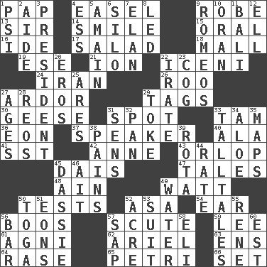 ACROSS 1. Infant food 4. Artist's stand 9. Loose flowing garment 13. Title for a knight 14. Grin 15. Taken by mouth 16. Binary compound 17. Vegetable dish 18. Shopping center 19. Compass dir. 21. Electrically charged atom 22. Ancient Celtic tribe of eastern Britain 24. SW Asia republic 26. Friend of Pooh 27. Zeal 29. Labels 30. Honkers 31. Blemish 33. Scottish cap 36. A really long time 37. Orator 40. Insect wing 41. Fast jet (abbr.) 42. Queen of England 1702-14 43. Fourth or lowest deck 45. Raised platform 47. Stories 48. The 18th letter of the Arabic alphabet 49. Electrical Unit 50. Trials 52. White ___ sheet 54. Hearing organ 56. Expressions of contempt or scorn 57. Scutum 59. Area sheltered from the wind 61. Hindu god of fire 62. Satellite of Uranus 63. Followers of ems 64. To erase 65. _ dish (used to culture cells) 66. Put into a specified state DOWN 1. 23rd letter of the Greek alphabet 2. Assistant 3. Elected leader of a country 4. Double-curved letter 5. At full speed 6. Grain storage tower 7. Liveliness 8. Directed 9. Lover boys 10. Northwest Algerian city 11. Indonesian resort city 12. Pipe bend 20. Greek god of love 22. Feeling or showing extreme anger 23. Gear tooth 25. Ancient Greek god of war 27. Eras 28. Vintage cars 29. Casino tip 31. Elected reps. 32. Baking dish 33. Baron Munchausen's specialties 34. Medicinal plant 35. Atlas contents 38. Aches 39. Round or rotation of duties 44. Assign a rank or rating to 45. Small ungulate mammals of Africa 46. Small island 49. Wetness 50. Ancient Roman robe 51. Immeasurably long periods of time 52. 1/640 square mile 53. Set or collection 55. French philosopher Descartes 56. Oblong piece of solid material 57. Plant excrement 58. Connecticut Ivy Leaguer 60. Eastern Standard Time (abbr.)