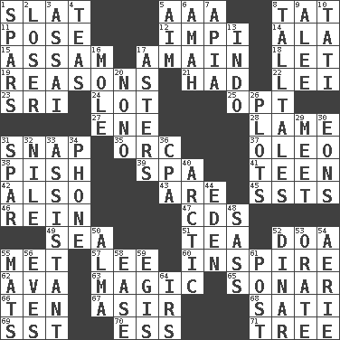 ACROSS 1. Narrow board 5. American Automobile Association (abbr.) 8. Make lace 11. Introduce or present, as a question 12. Body of Kaffir warriors 14. Wing 15. Indian state 17. With great haste 18. Allow 19. Thinks logically 21. Possessed 22. Luau accessory 23. Indian title of respect (Mr.) 24. Car dealer's back yard 25. Elect 27. Compass dir. 28. Unable to walk 31. Fastener 35. The grampus (Milton) 37. Butter sub 38. Expression of disdain 39. Health resort 41. Adolescent 42. In addition 43. "We ___ not amused" (Victoria) 45. Fast planes 46. It's straight from the horse's mouth 47. Music discs 49. Ocean 51. Beverage made from leaves 52. ___ good deed 55. Was introduced to 57. Area sheltered from the wind 60. Stimulate to action 62. Actress Gardner 63. Mysterious quality of enchantment 65. Echolocation 66. "___ Little Indians" 67. SW Saudi Arabia district 68. Suttee (variant) 69. Fast jet (abbr.) 70. Curvy letter 71. Woody plant DOWN 1. Practice fights 2. Failure 3. Slender Brazilian palm 4. Beverages made from leaves 5. Direct toward a target or goal 6. Wet nurse 7. Capital of Western Samoa 8. Baron Munchausen's specialties 9. Toward shelter 10. Jacques of French films 13. _ china 16. Undercover agent 17. Michaelmas daisies 20. Words to Nanette 26. Small pieces of grounds 29. Confront 30. Immeasurably long periods of time 31. Practice fight 32. Mediterranean tributary 33. Aide 34. Give a jingle 36. Accounting whiz (abbr.) 40. Northern region 44. Genesis locale 48. Backtalk 50. _ mater 52. Middle Eastern gold or silver currency 53. Declaim 54. Nest on high 55. Floor coverings 56. Nights before holidays 58. Relaxation 59. Armor plate that protects the chest 61. Mail 64. Big collection agency