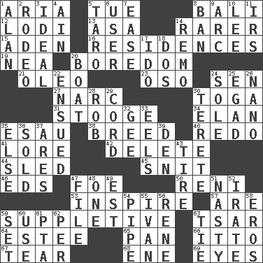 ACROSS 1. Operatic vocal solo 5. Third day of the wk. 8. Indonesian resort city 12. Farming town in central California 13. White ___ sheet 14. More uncommon 15. Arabian gulf 16. Dwellings 19. Teachers' org. 20. Mood resulting from idleness 21. Margarine 23. Bear (Spanish) 24. Elected rep. 27. Drug cop 30. Ancient Roman robe 31. Moe Howard, for one 34. Style 35. He sold his birthright 38. A special lineage 40. Make new 41. Old wives' tales, e.g. 42. Keyboard key 44. Downhill vehicle 45. In a ____ (agitated or irritated) 46. Begley and Asner 47. Enemy 50. Painter Guido (1575-1642) 53. Motivate 57. "We ___ not amused" (Victoria) 59. Supplying deficiencies 63. Russian ruler of old 64. First name in cosmetics 65. Baking dish 66. "Tell ____ the Marines!" 67. Lacerate 68. Compass dir. 69. Snake ____ (dice throw) DOWN 1. Actor Alda or Thicke 2. Cowboy competition 3. Perfect 4. The 18th letter of the Arabic alphabet 5. Edible starchy tuberous root 6. One who uses or employs something 7. Comfort 8. Prohibit 9. Curve 10. Area sheltered from the wind 11. Big collection agency 14. San ____ (Riviera town) 17. Wedding promise 18. Two (Sp.) 20. Water vessel 22. Followed as a consequence or result 24. Not divided or shared with others 25. Mild oath 26. Billionth: prefix 28. Director Reiner 29. Drawstring 30. Cylindrical with tapered ends 32. Turn to the right 33. Snakelike fish 35. Otherwise 36. Disposed of to a purchaser 37. Ancient Greek god of war 39. Lair 43. Become fatigued 47. Do some clerical work 48. Single 49. Eastern Standard Time (abbr.) 51. Offensive 52. Feeling or showing extreme anger 54. Corncob 55. _ the terrible 56. French philosopher Descartes 58. Greek god of love 59. Arrange properly for use 60. Purpose 61. Parent Teacher Association (abbr.) 62. For each 63. Neckwear