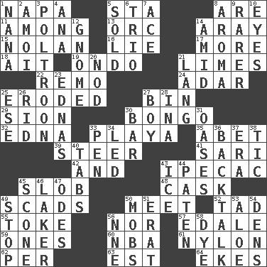 ACROSS 1. California wine valley 5. R.R. building 8. "We ___ not amused" (Victoria) 11. Amid 13. The grampus (Milton) 14. Like ___ of sunshine 15. Pitcher Ryan 16. Untruth 17. Greater amount 18. Small island 19. Southwest Nigerian state 21. Citrus fruits 22. San ____ (Riviera town) 24. The sixth month of the Jewish calendar 25. Eaten away 27. Storage container 29. The Jewish people; Israel 30. Beat drum 32. Pulitzer Prize-winning author Ferber 33. Beach, in Buenos Aires 35. Collude with 39. Navigate 41. Indian skirt 42. Added to 43. Medicinal drug used to evoke vomiting 45. Messy guy 48. Keg 49. Tons 50. Rendezvous 52. Small amount or degree 55. Puff or smoke 56. Not either 57. Peak District village in England 59. Singles 60. Basketball assoc. 61. High-strength synthetic material 62. For each 63. Eastern Standard Time (abbr.) 64. Supplements with great effort DOWN 1. Grandmother 2. Mine, in Marseilles 3. Coward 4. Santa ___, CA 5. Disposed of to a purchaser 6. Musical group of three 7. Adept person 8. Scent 9. More valued for its uncommonness 10. Snake ____ (dice throw) 12. Dwarf 14. Among 20. Lower and raise head in agreement 21. Long (Scottish) 23. Ferber et al. 25. Compass dir. 26. To free from 27. Male child 28. _ tizzy (2 wds.) 30. Oblong piece of solid material 31. Fertile tracts in a desert 33. Writing instrument 34. Directed 36. Sass 37. Epoch 38. Nervous spasm 40. Bar bills 43. Frozen water 44. Eucharist need 45. Biscuitlike quick bread 46. Member of a famous L.A. basketball team 47. Lyric poems 49. Discontinue 50. Disorderly crowds 51. Part of Q.E.F. 53. _ vera 54. Hiding places for outlaws 56. Compass dir. 58. Color