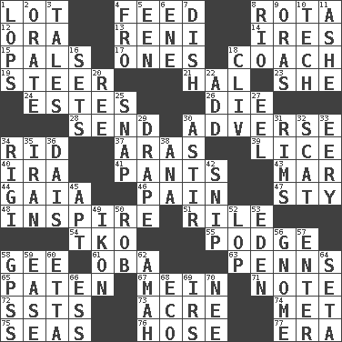 ACROSS 1. Car dealer's back yard 4. Nourish 8. Roll call or roster of names 12. Mouth or opening 13. Painter Guido (1575-1642) 14. Angers 15. Friends 17. Washington bills 18. Team commander 19. Navigate 21. Actor Linden 23. A female animal or person 24. _____ Park, CO 26. Expire 28. Post 30. Contrary to your interests or welfare 34. To free from 37. Ancient river in northeast Turkey 39. Louse (plural) 40. Lyricist Gershwin 41. Leg coverings 43. Third mo. 44. Greek goddess of the earth (variant) 46. Ache 47. Filthy place 48. Motivate 51. Cause heat under the collar 54. Ring climax 55. Puddle 58. Unit of force equal to gravity 61. Chief or king in Benin or Nigeria 63. Actor Sean's family 65. Eucharist need 67. Count _ (2 wds.) 71. Observe 72. Fast planes 73. Land measure 74. Was introduced to 75. Oceans 76. Flexible conduit 77. Period DOWN 1. Chops off 2. Declaim 3. Lies 4. Back 5. Car or cant ending 6. Compass dir. 7. Food container 8. _ de Janeiro 9. Mouths or openings 10. Technology 11. American tennis player Robert 16. Puts into a specified state 18. 154 in Roman numerals 20. To sift 22. Find the sum of 25. Fastener 27. Snakelike fish 29. Window treatment 30. Moving about 31. Basketball hoops 32. Jazz singing style 33. Suggestive of the supernatural 34. Swiss mountan, "Queen of the Mountains" 35. SW Asia republic 36. Raised platform 38. Santa ___, CA 42. Clip 45. Fitting 49. Visual representation of an object 50. Director Reiner 52. Trim (branches) 53. Genesis locale 56. Dwarf 57. Keyboard key 58. Global Positioning Systems (abbr.) 59. Comfort 60. Singer James 62. Nanny 64. Bristle 66. Curvy letter 68. Environmental prefix 69. Big collection agency 70. Born