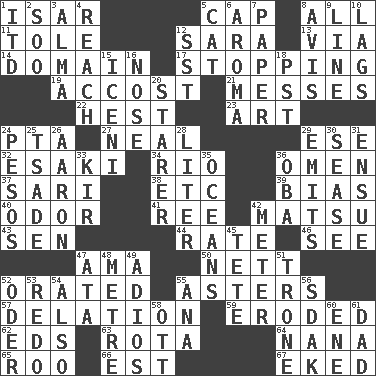 ACROSS 1. Austrian river, tributary to the Danube 5. Head covering 8. Everything 11. Lacquered or enameled metalware 12. "Two Mules for Sister ____" 13. By way of 14. Kingdom 17. Discontinuing 19. Buttonhole 21. Makes clutter 22. Command 23. Tate display 24. Parent Teacher Assoc. 27. Be tempered by heat 29. Compass dir. 32. 1973 Nobel Price Winner (Physics) Leo 34. River (Sp.) 36. Sign of things to come 37. Indian skirt 38. And so on (abbr.) 39. Prejudice 40. Aroma 41. Portuguese money of account (variant) 42. Taiwanese island in East China Sea 43. Elected rep. 44. Pace 46. Observe 47. Nanny (var.) 50. Remaining after all deductions 52. Declaimed 55. Michaelmas daisies 57. Accusation by an informer 59. Eaten away 62. Begley and Asner 63. Roll call or roster of names 64. Grandmother 65. Friend of Pooh 66. Eastern Standard Time (abbr.) 67. Made supply last DOWN 1. It would 2. "Barney Miller" actor Jack 3. _ mater 4. Arrive at 5. Feline 6. Scent 7. Some stationery 8. Opinion 9. Actor's bit 10. Fails to keep up a pace 12. Fast jet (abbr.) 15. Ancient Celtic tribe of eastern Britain 16. Olfactory organ 18. Pacific Standard Time (abbr.) 20. A viewer who gazes fixedly 24. Mexican monetary units 25. Sadhe (variant) 26. Composer Copland 28. 61 cubic inches 29. Sends forth 30. Gospel singer Marvin 31. Follow as a consequence or result 33. Apertif with cassis 35. Seas 36. Chief or king in Benin or Nigeria 42. Distance measurement 45. Wig 47. "One Day ___ Time" 48. Distance measurement (Brit.) 49. Goodbye (Sp.) 51. Heavy duty weighing machine 52. River in Europe 53. Make new 54. In addition 55. Santa ___, CA 56. Neighbor of Neb. 58. Baseball player Mel 60. Compass dir. 61. June honoree