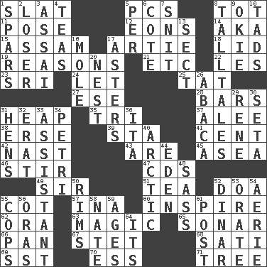 ACROSS 1. Narrow board 5. Personal Computers (abbr.) 8. Small child 11. Introduce or present, as a question 12. Immeasurably long periods of time 14. Alias (abbr.) 15. Indian state 17. Nick name for Arthur 18. Flaplike covering 19. Thinks logically 21. And so on (abbr.) 22. French article 23. _ Lanka 24. Allow 25. Make lace 27. Compass dir. 28. Long, evenly shaped pieces 31. Pile 35. Three (prefix) 37. Toward shelter 38. Celtic language 39. R.R. building 41. Penny 42. Political cartoonist Thomas 43. "We ___ not amused" (Victoria) 45. Toward the sea 46. Agitate 47. Music discs 49. Title for a knight 51. Afternoon social gathering 52. ___ good deed 55. Small bed 57. _ tizzy (2 wds.) 60. Motivate 62. Mouth or opening 63. Mysterious quality of enchantment 65. Underwater navigation system 66. Baking dish 67. Proofreading order 68. Suttee (variant) 69. Fast jet (abbr.) 70. Curvy letter 71. Relationship diagram DOWN 1. Practice fights 2. Failure 3. Slender Brazilian palm 4. Afternoon social gatherings 5. For each 6. ____ d'Azur (French Riviera) 7. In a ____ (agitated or irritated) 8. Baron Munchausen's specialties 9. Migrant worker of the '30s 10. Small amounts or degrees 13. Religious group 16. Undercover agent 17. Michaelmas daisies 20. A home for chicks 26. Phillipine bananalike plant 29. French philosopher Descartes 30. Bristle 31. Coop moms 32. Part of Q.E.F. 33. Helper 34. _ dish (used to culture cells) 36. Call ___ day 40. Northern region 44. Genesis locale 48. Backtalk 50. Basketball hoops 52. Middle Eastern gold or silver currency 53. Speak pompously 54. Nest on high 55. 911 reaches them 56. Mouths or openings 58. Nathan's nickname 59. Eons 61. Mail 64. ___ a Wonderful Life