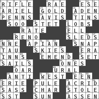 ACROSS 1. Ransack; plunder; pillage 6. Actress Charlotte 9. Compass dir. 12. Satellite of Uranus 13. Aureate 14. An important port of Yemen 15. Actor Sean's family 16. Opinion 17. Canisters 18. "Barney Miller" actor Jack 19. Proofreading order 20. Tennis shots 21. Pace 23. Pipe bend 24. Western Nevada city 25. Bobsleighs 28. Compass dir. 30. Bee-related 34. Fastener 35. The 19th letter of the Greek alphabet 36. Atmospheres 38. Epoch 39. Lodging establishments 41. Make improvements or corrections to 43. Arrange properly for use 44. Moves on water 46. Singles 48. Boat paddle 49. Mountain range 50. Against 51. Compass direction 53. Car or cant ending 56. One of the Great Lakes 57. Whine 58. Bitter 60. Backtalk 61. Burn to charcoal 62. Fur scarf 63. Fast jet (abbr.) 64. Player for Phoenix 65. NE Netherlands city DOWN 1. Reproach for some lapse or misdeed 2. Angers 3. A pale, very dry sherry 4. Poe poem 5. Raised railways 6. Be footloose 7. Came down and settled, as after flight 8. Begley and Asner 9. The property of being fit to eat 10. Elected reps. 11. Followers of ems 13. Yard entry 14. Ringlike coral islands and reefs 19. Discontinues 20. French article 22. Santa ___, CA 24. One who advocates reunion 26. Have the gumption 27. Argument over a trivial matter 28. Nuclear Threat Initiatives 29. Nanny 31. Eisenhower's nickname 32. Direct toward a target or goal 33. Born 37. Derisive sound 40. Chalkboards 42. Heredity factor (abbr.) 45. Indian title of respect (Mr.) 47. Chooses 49. One who makes use of a thing 50. Ancient river in northeast Turkey 51. Chinese city south-southwest of Nanjing 52. Flair 54. Greek god of love 55. "Death on the ____" 56. Double-curved letter 57. Personal Computers (abbr.) 58. White ___ sheet 59. Lair