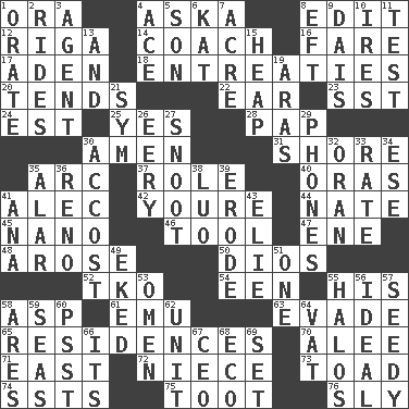 ACROSS 1. Mouth or opening 4. "____ silly question..." 8. Prepare for publication 12. Capital of Latvia 14. Team commander 16. Conductor's collection 17. Arabian gulf 18. Pleas 20. Is inclined (to) 22. Hearing organ 23. Fast jet (abbr.) 24. Eastern Standard Time (abbr.) 25. Affirmative reply 28. Infant food 30. So be it 31. Dinah or Pauly 35. Curve 37. Hero or heavy, e.g. 40. Mouths or openings 41. Actor Baldwin 42. You are 44. Nathan's nickname 45. Billionth: prefix 46. Implement 47. Compass dir. 48. Came up 50. "Vaya con ____" 52. Ring climax 54. Car or cant ending 55. Part of HMS, perhaps 58. Cleo's killer 61. Australian flightless bird 63. Dodge 65. Dwellings 70. Toward shelter 71. 90 degrees 72. Sibling's daughter 73. Frog relative 74. Fast planes 75. A blast of a horn 76. Playfully artful DOWN 1. Declaim 2. Amusement-park features 3. Rep 4. Adept person 5. Male offspring 6. Krazy ___ of comics 7. 1/640 square mile 8. Bank Draft (abbr.) 9. Raised platform 10. Angers 11. Trial 13. Also 15. Pile 19. Ancient river in northeast Turkey 21. Symbol (abbr.) 26. Suggestive of the supernatural 27. Snout, nose 29. Gives a jingle 30. Buttonhole 32. Northwest Algerian city 33. Assign a rank or rating to 34. Compass dir. 35. Having or resembling wings 36. Western Nevada city 38. Nilotic language 39. Wear away 41. Santa ___, CA 43. Writer Wiesel 49. Supplemented with great effort 51. Single 53. Presage 55. Rings 56. Standard of perfection 57. Morally degraded 58. Ancient Greek god of war 59. Oceans 60. Inconspicuous attention getter 62. A single undivided whole 64. Large container 66. ___ a Wonderful Life 67. Corporate head (abbr.) 68. Environmental prefix 69. Put into a specified state