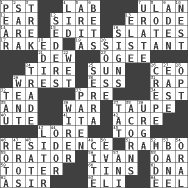 ACROSS 1. Pacific Standard Time (abbr.) 4. Experiment locale 7. ____ Bator 11. Hearing organ 12. Father 13. Eat (away) 14. "We ___ not amused" (Victoria) 15. Prepare for publication 16. Chalkboards 17. Swept the length of 19. Aide 21. Morning condensation 23. Double curve, resembling the letter S 24. Become fatigued 25. Player for Phoenix 26. Corporate head (abbr.) 29. Obtain by seizing forcibly or violently 30. Curvy letter 31. Hit sharply and swiftly 32. Beverage made from leaves 33. Before (prefix) 34. Eastern Standard Time (abbr.) 35. Added to 36. Armed conflict 37. Grayish beige 40. Shoshoni 41. Call ___ day 42. 1/640 square mile 43. Old wives' tales, e.g. 45. Coat; cloak 46. Dwelling 51. Role for Stallone 55. Speaker 56. _ the terrible 58. Boat paddle 59. Carrier 60. Airtight sealed metal containers 61. Heredity factor (abbr.) 62. SW Saudi Arabia district 63. Connecticut Ivy Leaguer 64. Snakelike fish DOWN 1. Lightbulb-shaped fruit 2. "Two Mules for Sister ____" 3. Long journey 4. Flaplike covering 5. Roberta Peters solo 6. Wagers 7. A salt of uric acid 8. Globular water bottle used in Asia 9. Arabian gulf 10. A home for chicks 12. Spring feasts 13. Otherwise 16. Attaches a signature 18. Singer Brickell 20. Boozer 22. Soggy 24. Exchange 25. Spanish missionary in California 26. Streamer paper 27. Relaxation 28. Elect 29. Left 32. The 19th letter of the Greek alphabet 33. Eucharist need 36. One who wires 37. Make lace 38. Oak nuts 39. Capital and largest city of Mongolia 43. 61 cubic inches 44. Scent 46. Round or rotation of duties 47. Greek god of love 48. Suttee (variant) 49. Quote 50. Tending to cause great harm 52. Method 53. Object of repulsion 54. Taken by mouth 57. Cuckoo