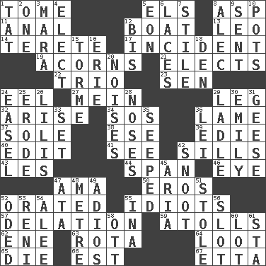 ACROSS 1. Heavy book 5. Raised railways 8. Cleo's killer 11. Of or related to the anus 12. Water vessel 13. Lion 14. Cylindrical with tapered ends 17. Event 19. Oak nuts 21. Chooses 22. Musical group of three 23. Elected rep. 24. Snakelike fish 27. Chow _ 29. Part of a journey 32. Ascend 34. Distress signal 36. Unable to walk 37. Not divided or shared with others 38. Compass dir. 39. Singer Brickell 40. Prepare for publication 41. Observe 42. Beverly of Met fame 43. French article 44. Connect, as a bridge 46. Sight organ 47. Wet nurse (var.) 50. Greek god of love 52. Declaimed 55. Foolish or stupid persons 57. Accusation by an informer 59. Ringlike coral islands and reefs 62. Compass dir. 63. Round or rotation of duties 64. Spoils 65. Pass on 66. Eastern Standard Time (abbr.) 67. Singer James DOWN 1. Make lace 2. Single 3. Hindu Mythology: god of death 4. Voters do this 5. Period of immesurable duration 6. Shoestrings 7. Vertical member of a panel or frame 8. Actor Baldwin 9. Emitted 10. Cooking vessels 12. Again 15. Singer Mel 16. One of the Great Lakes 18. Lair 20. Annoying sounds 24. Artist's stand 25. Wear away 26. Ms. Damita and namesakes 28. Olfactory organs 29. Dipping utensil 30. Poet Dickinson 31. Honkers 33. Arrange properly for use 35. Oozed 36. Luau accessory 42. Snob 45. Operatic vocal solo 47. _ moment's notice (2 wds.) 48. Distance measurement (Brit.) 49. Goodbye (Sp.) 51. Took without asking 52. Wrote a lyric poem 53. Painter Guido (1575-1642) 54. Toward shelter 55. _ tizzy (2 wds.) 56. Position in a hierarchy or organization 58. Baseball player Mel 60. Car dealer's back yard 61. R.R. building
